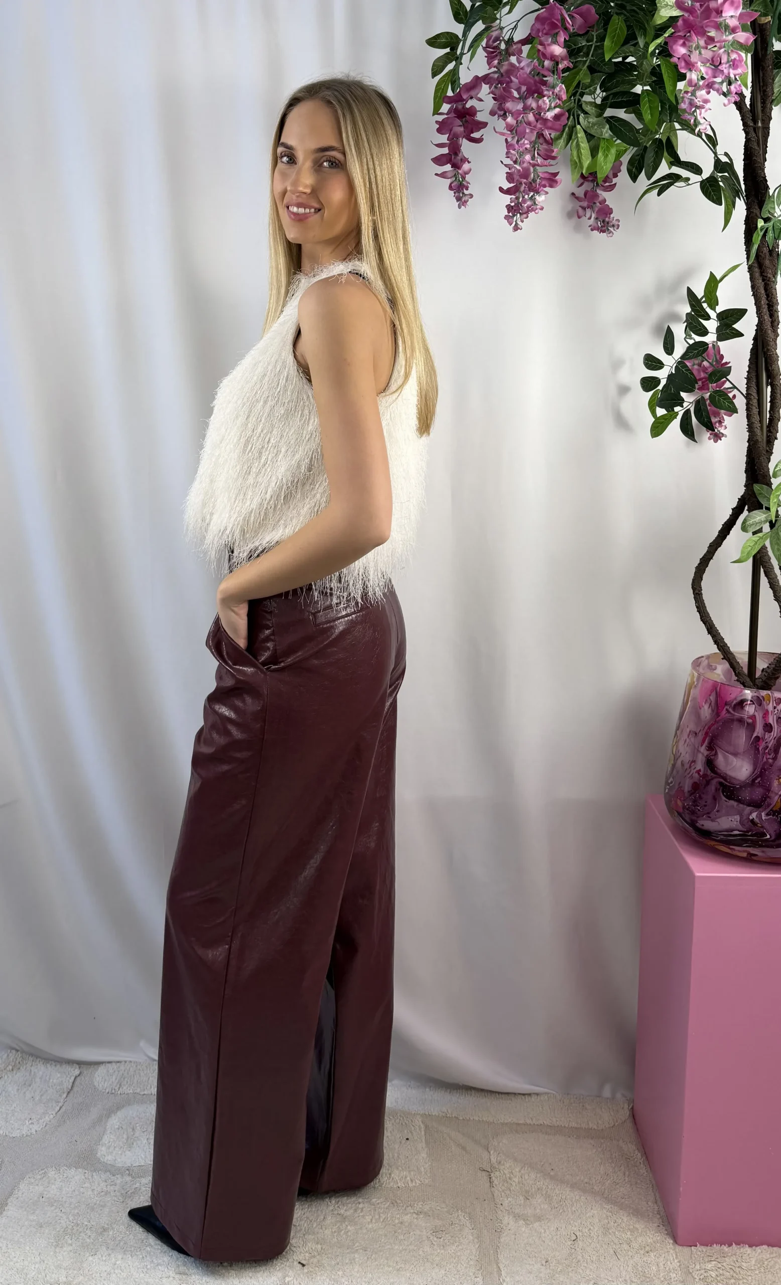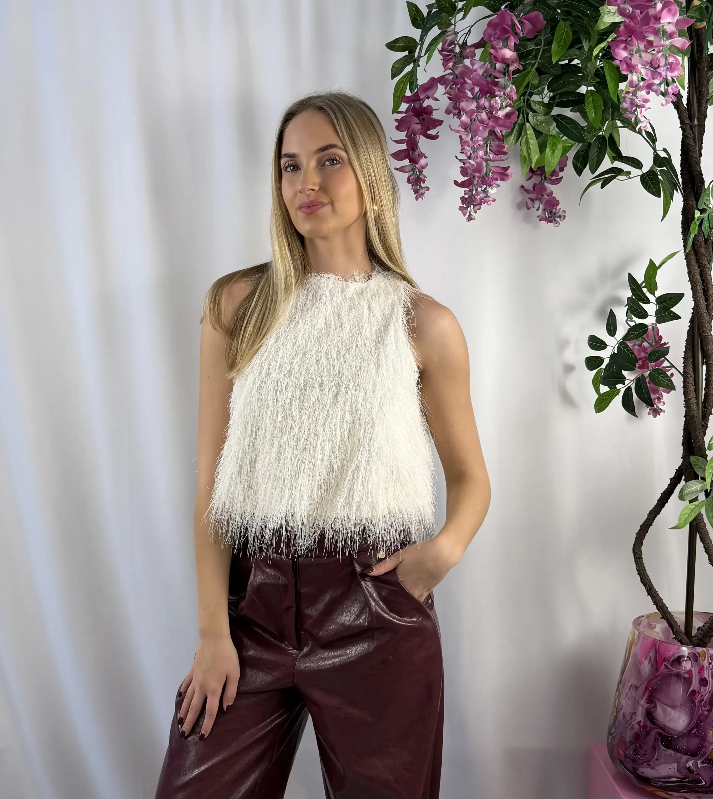 Deze crème kleurige harige top is hét perfecte statement item voor wie houdt van iets bijzonders. De zachte, fluffy stof geeft een luxe uitstraling en maakt elke outfit meteen af. Draag hem chic met een rok of pantalon voor een feestje, of juist casual met een jeans voor een trendy look.
