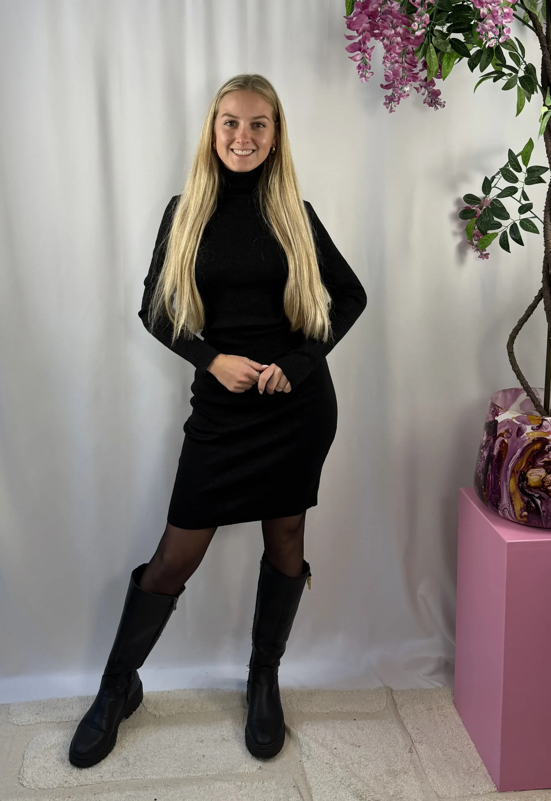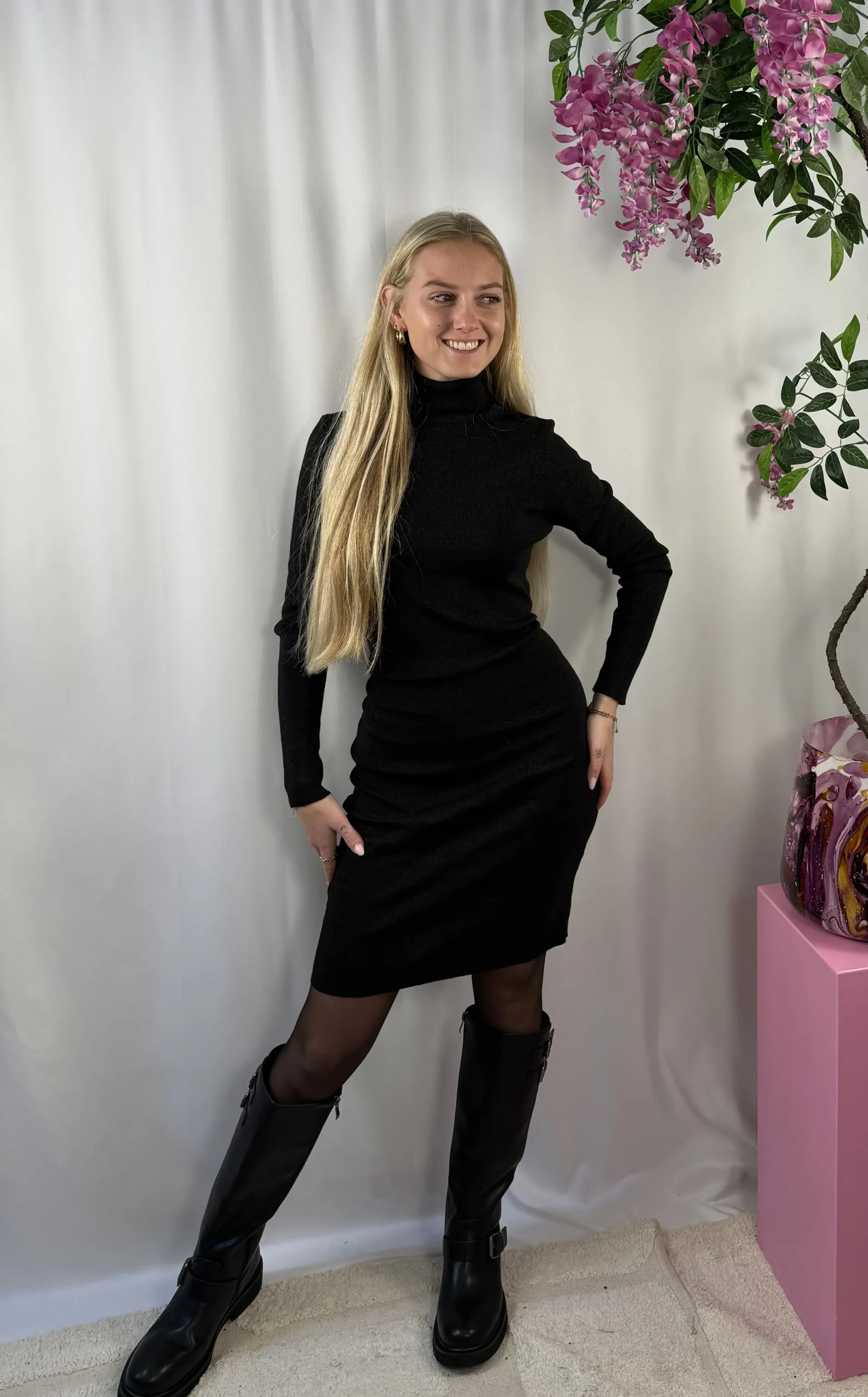 Deze prachtige jurk heeft een subtiele glitter die zorgt voor een chique en verfijnde uitstraling. De stof bevat veel stretch, waardoor de jurk heerlijk comfortabel zit en mooi langs het lichaam valt. Het model valt iets langer, wat zorgt voor een elegante, vrouwelijke look.