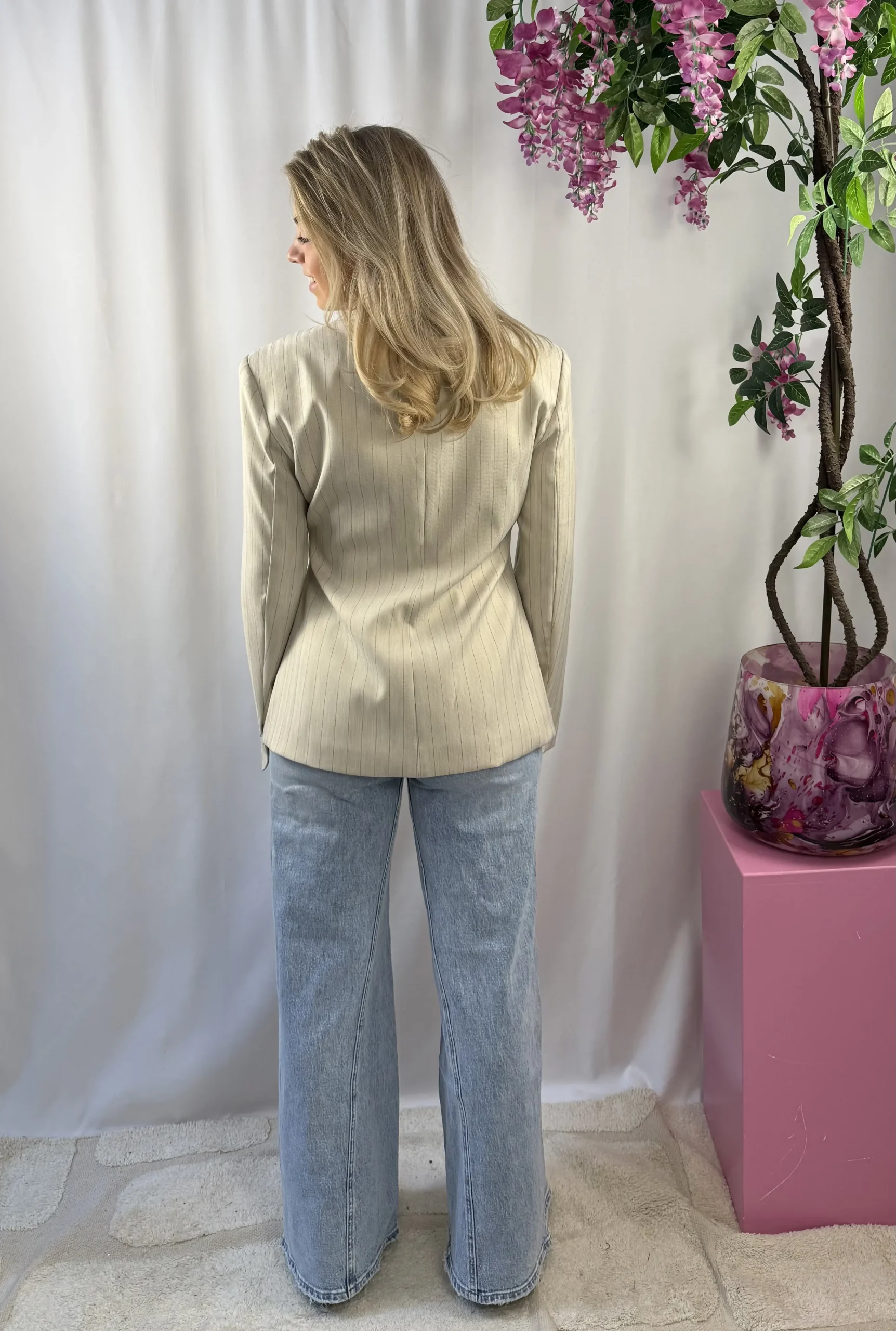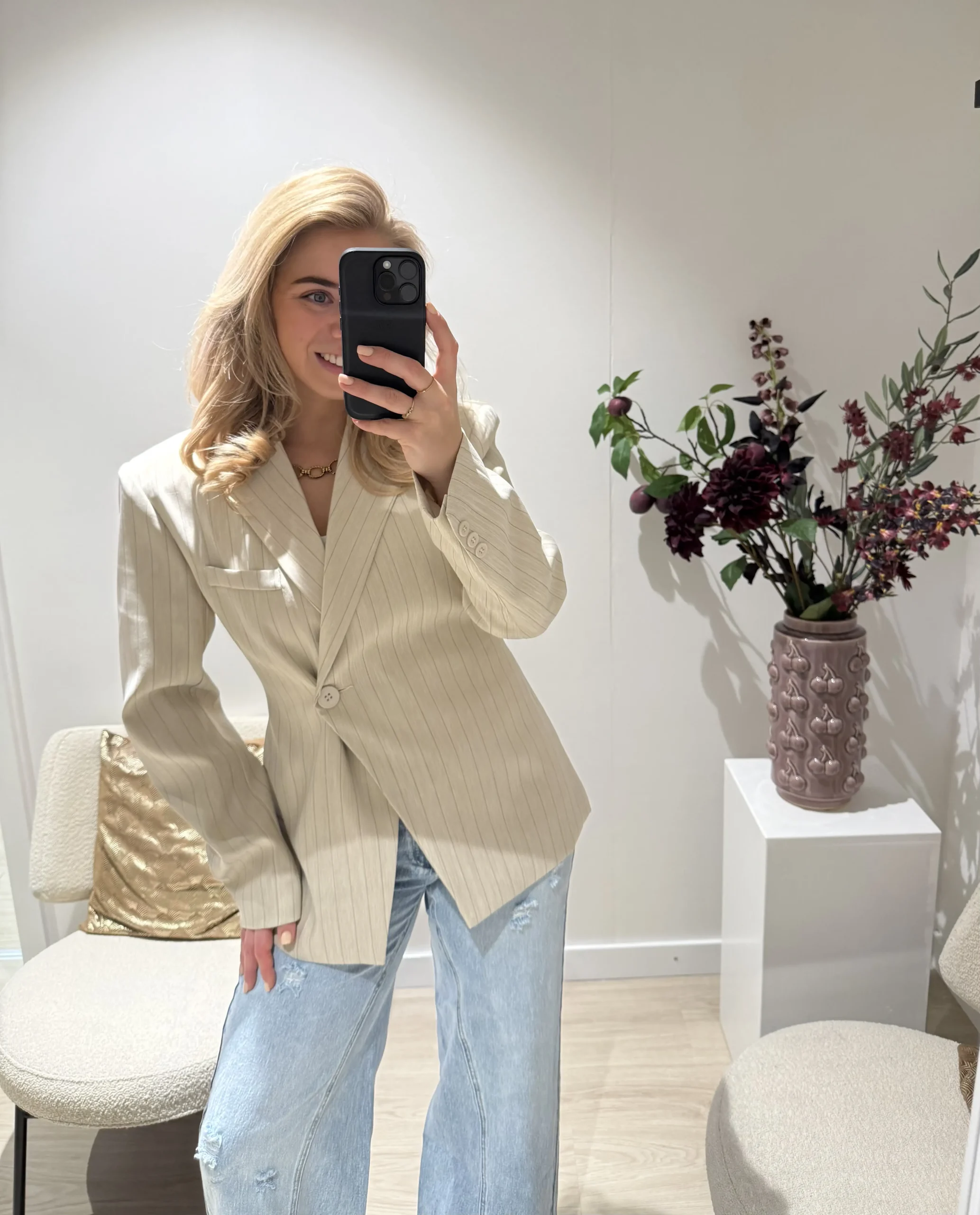 Deze blazer heeft een elegante, getailleerde pasvorm en is voorzien van schoudervulling, waardoor het silhouet extra mooi uitkomt en de taille prachtig wordt geaccentueerd. Een stijlvol item dat je zowel chic als stoer kunt dragen. Combineer de blazer met de bijpassende pantalon voor een complete, elegante look of draag hem op een jeans voor een meer casual, stoere uitstraling.