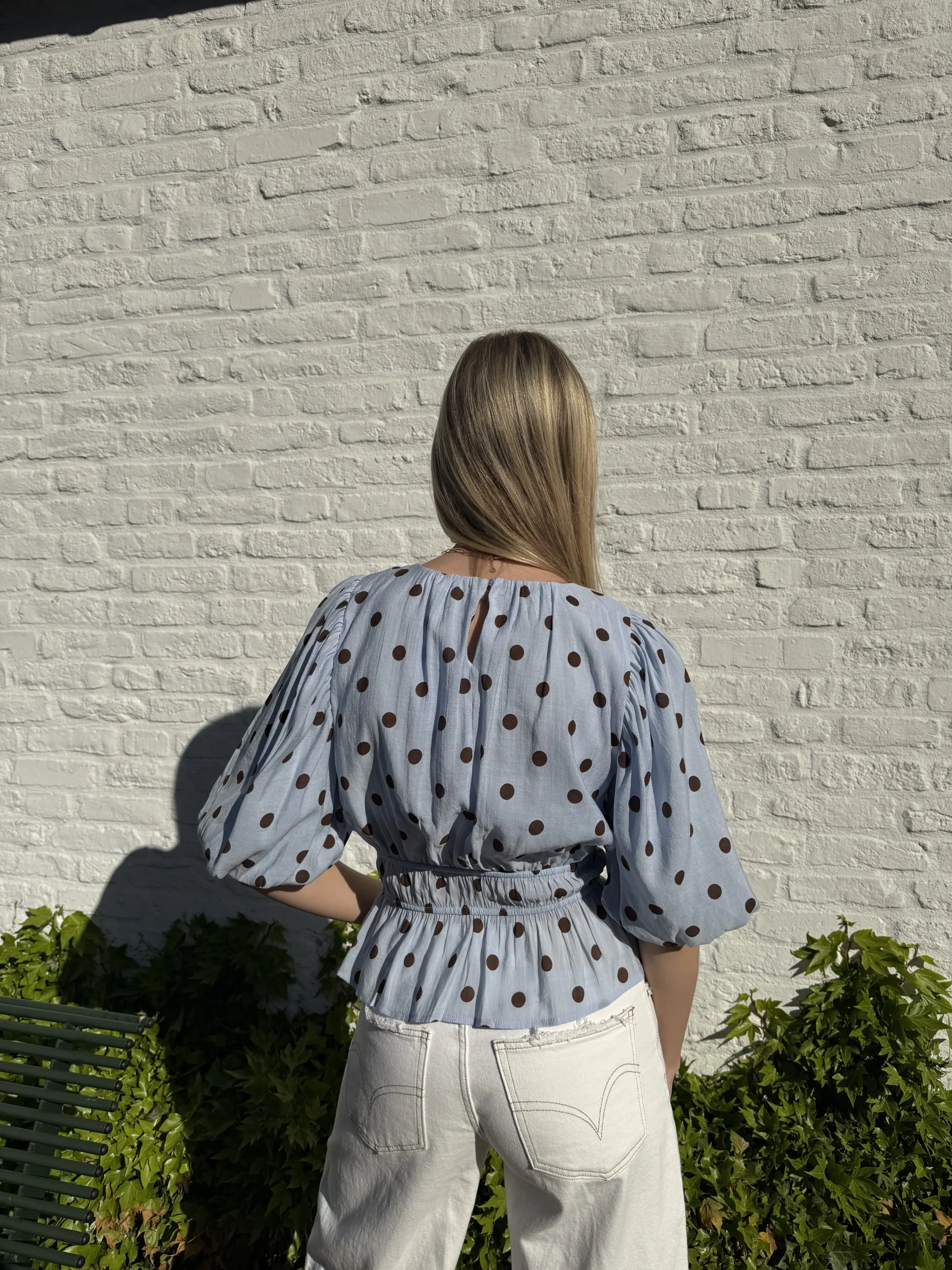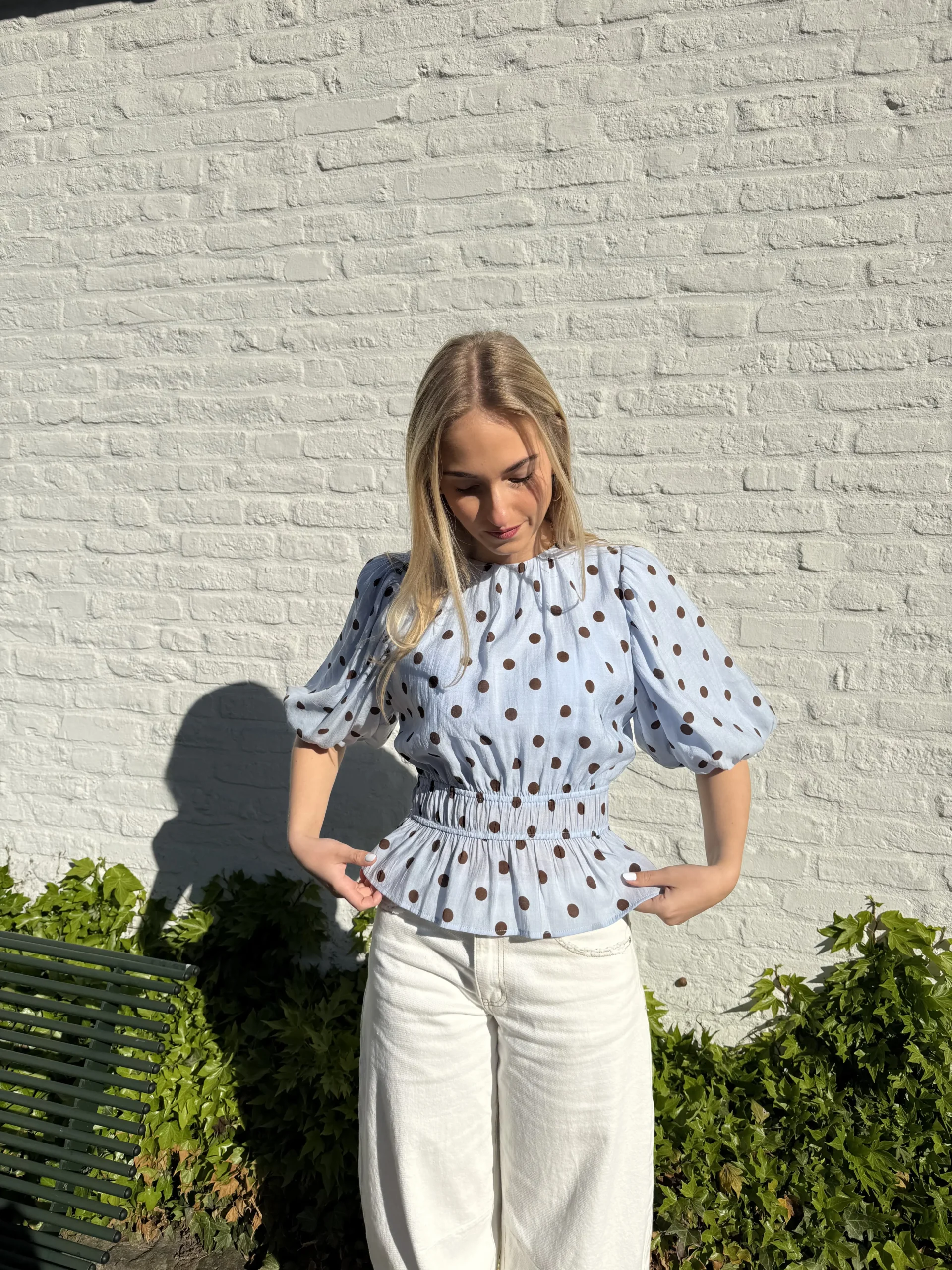 Elinay dot blouse blauw is een speelse en stijlvolle blouse met bruine stippen die zorgen voor een trendy en vrouwelijke uitstraling. De frisse blauwe kleur maakt dit item perfect voor het aankomende seizoen, terwijl de luchtige stof heerlijk comfortabel draagt. Ideaal om te combineren met een jeans, rok of pantalon voor een casual maar stijlvolle look.