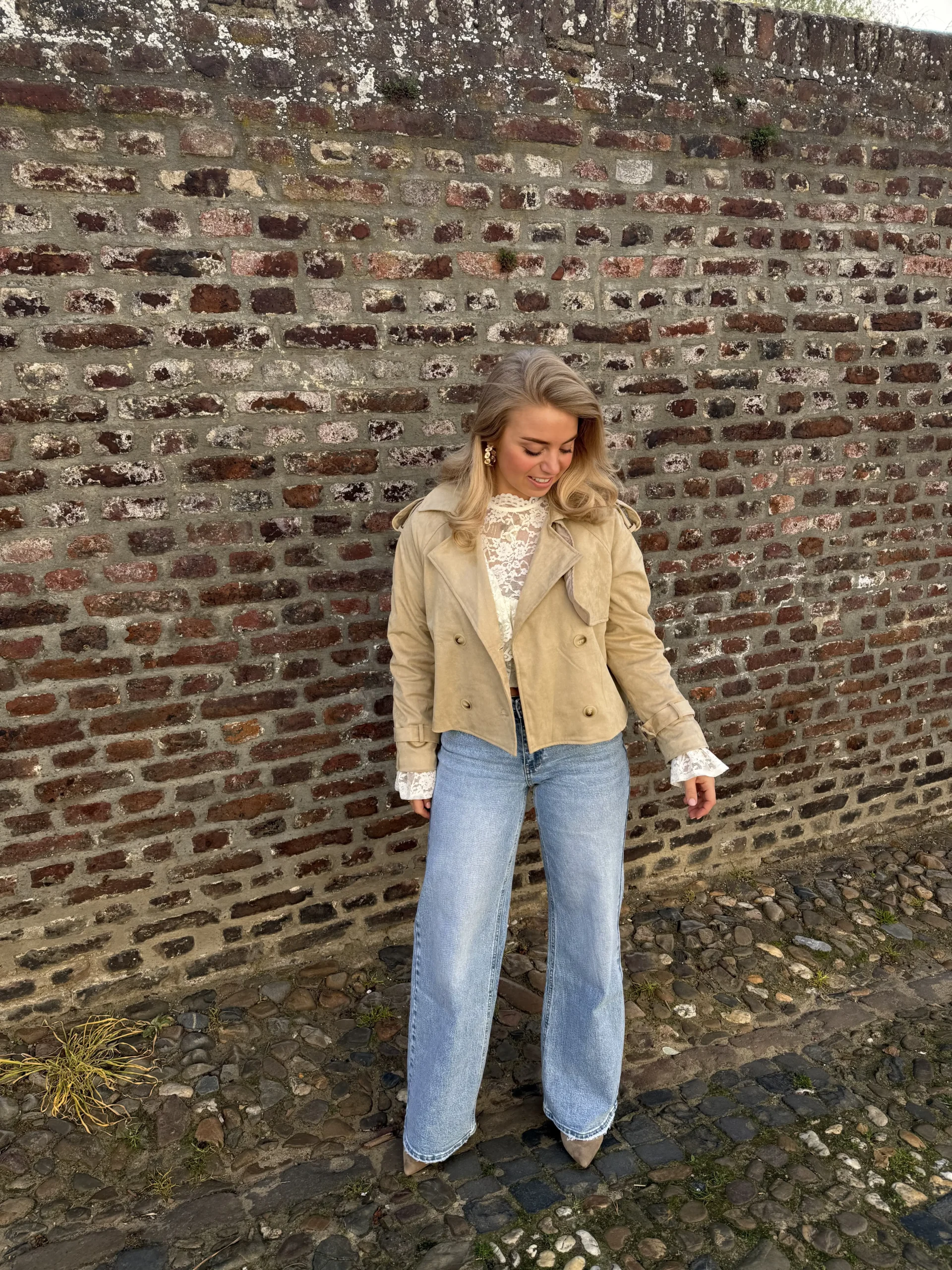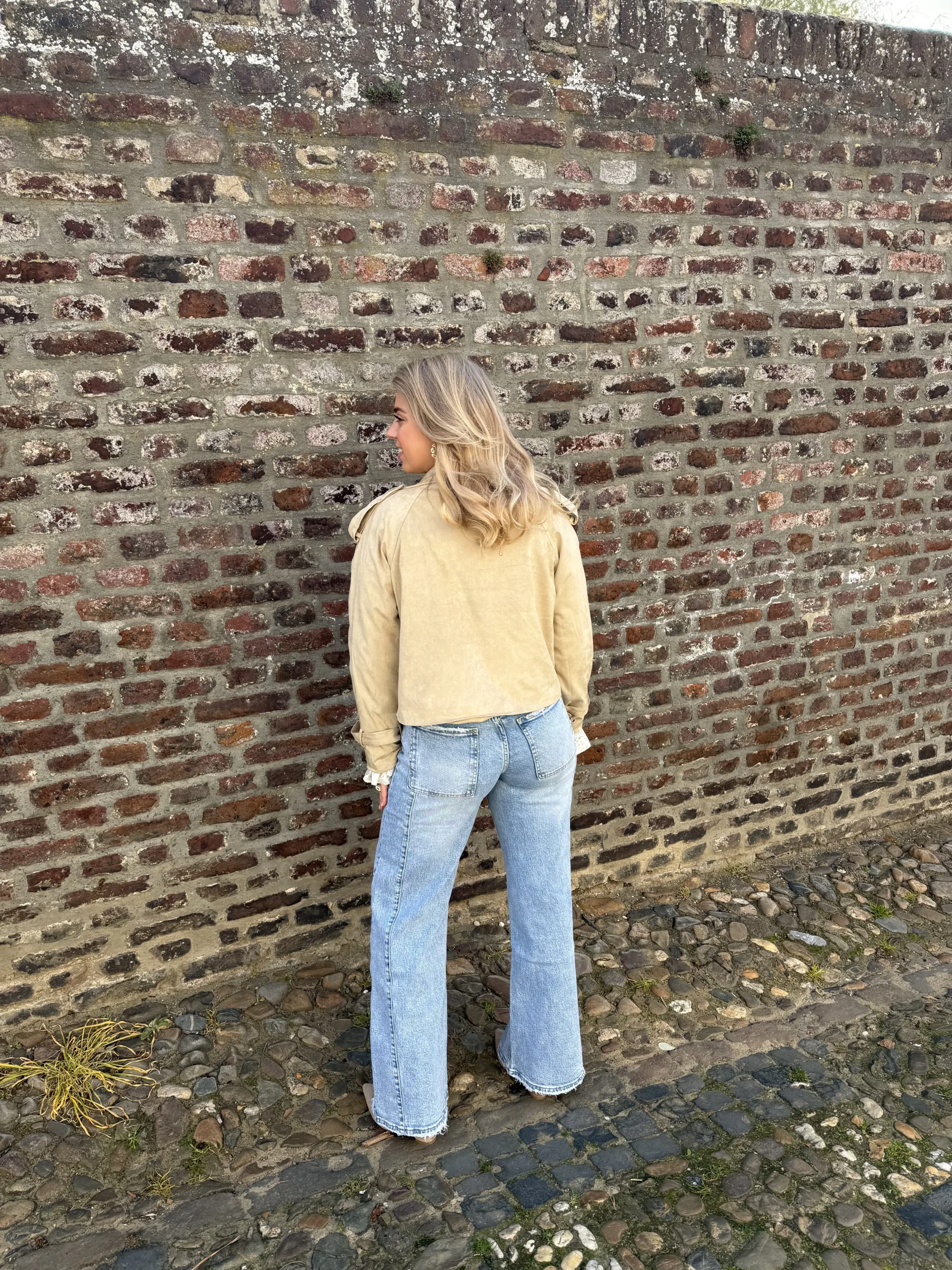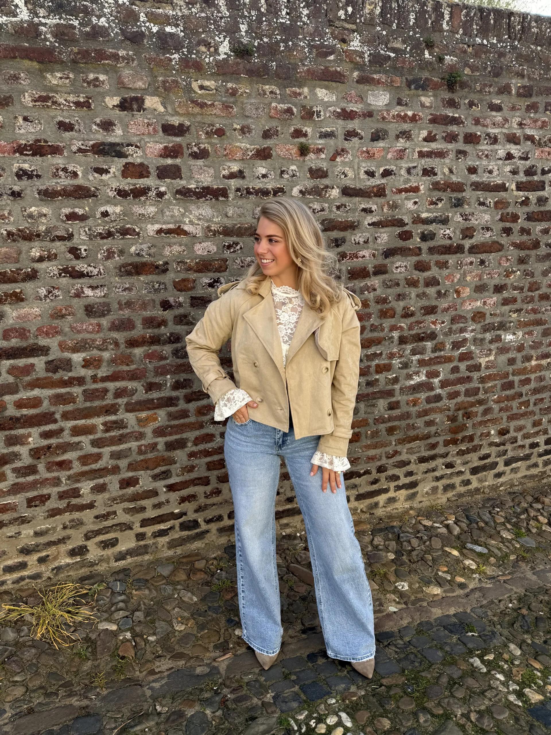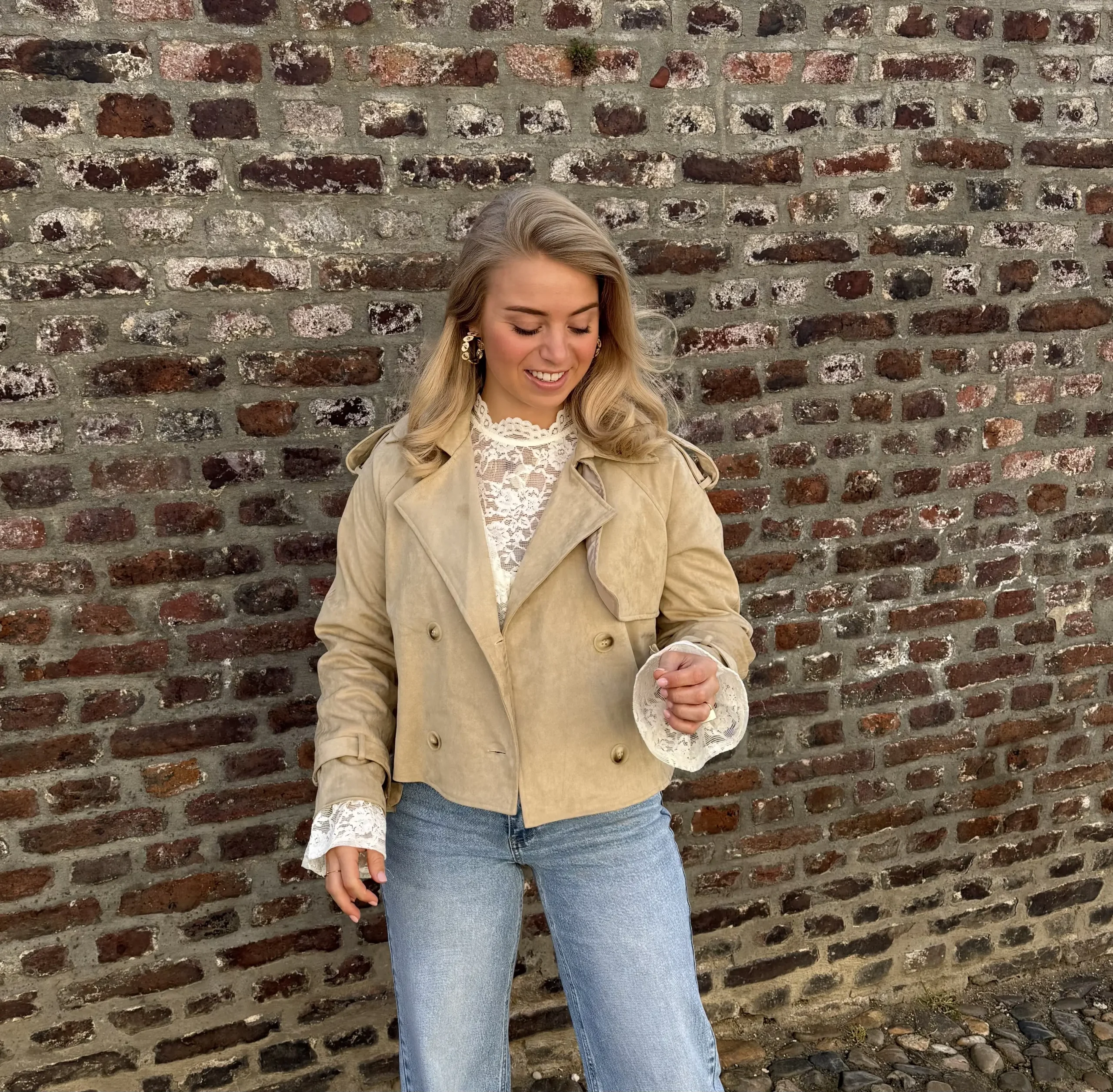 Faya jacket beige is een stijlvolle suedelook jas die jouw outfit direct een luxe en trendy uitstraling geeft. De zachte stof en de mooie taupe kleur maken dit jasje perfect voor het najaar en makkelijk te combineren. De knopen als detail zorgen voor een speelse en elegante touch. Een echte musthave die je eindeloos kunt dragen.