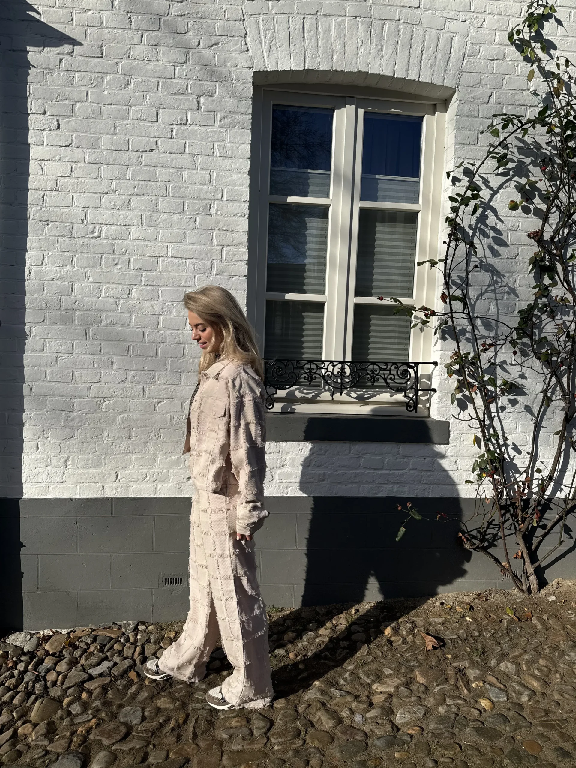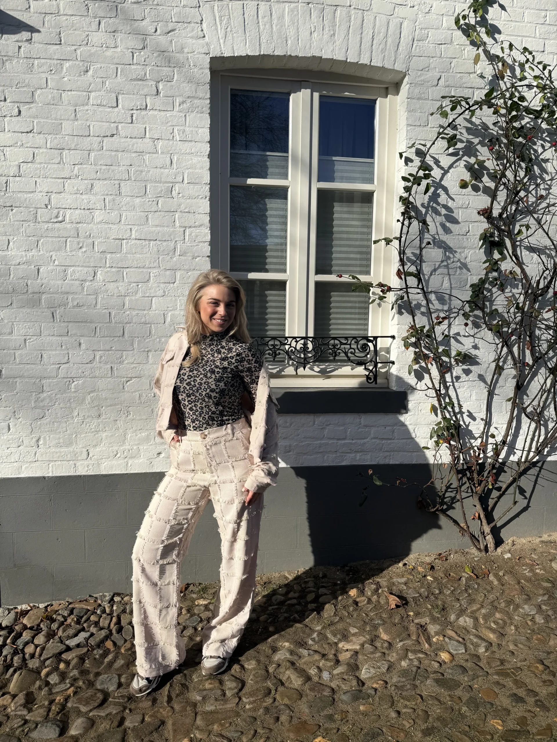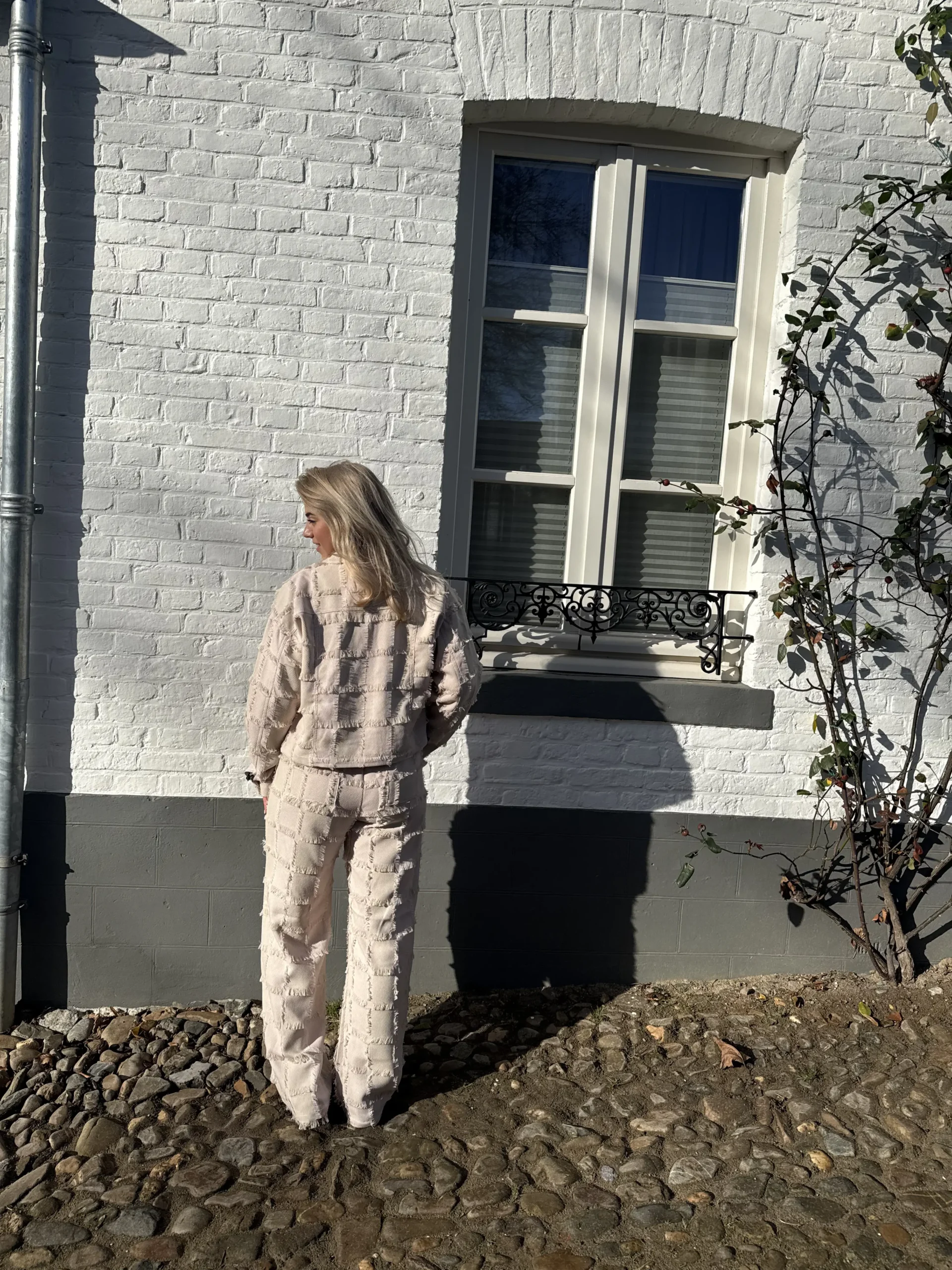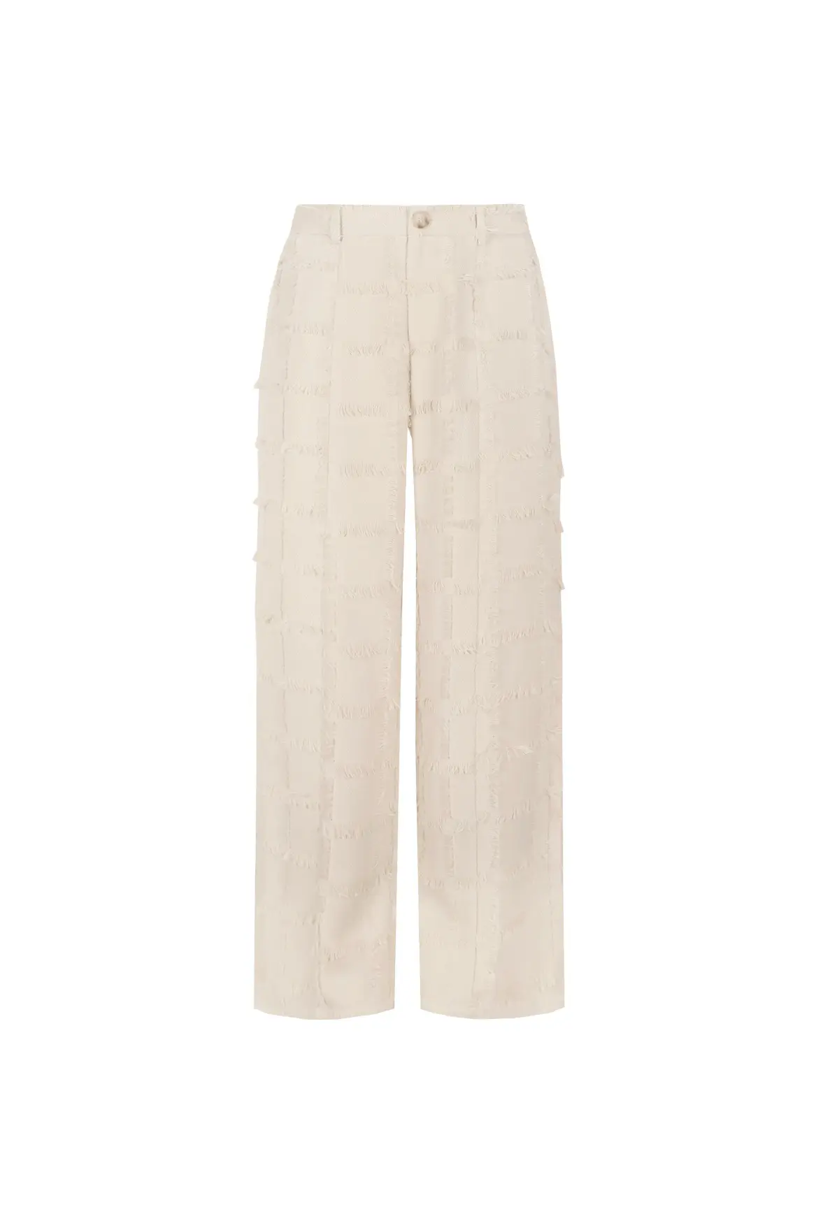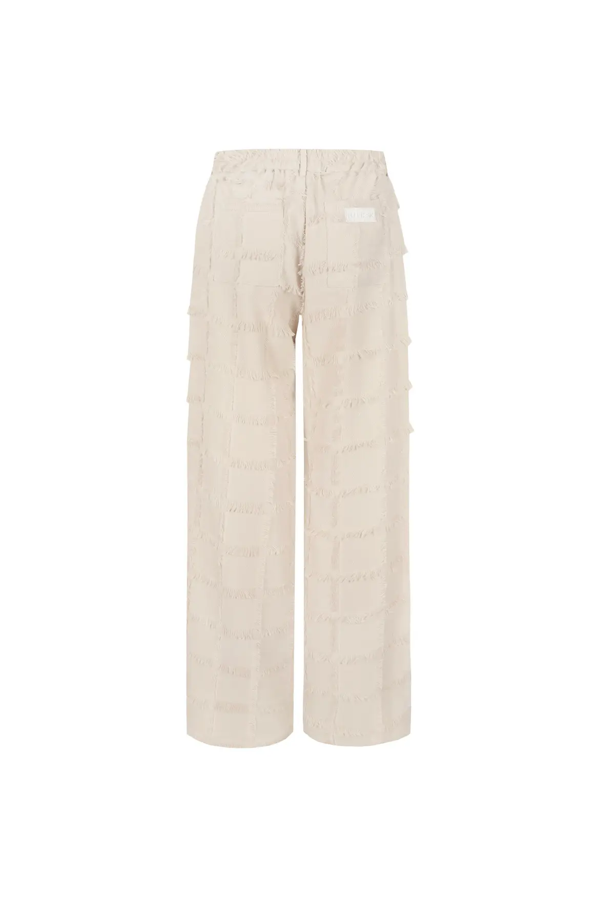 Kalina broek geeft letterlijk structuur aan je look. Deze beige broek is gemaakt van een stevige stof met speelse fringes en een subtiele ruitachtige textuur, wat zorgt voor een opvallende en moderne uitstraling. De rechte fit maakt de broek makkelijk te stylen: draag hem als statement met de bijpassende jacket of combineer met een eenvoudige top voor een stijlvolle balans.