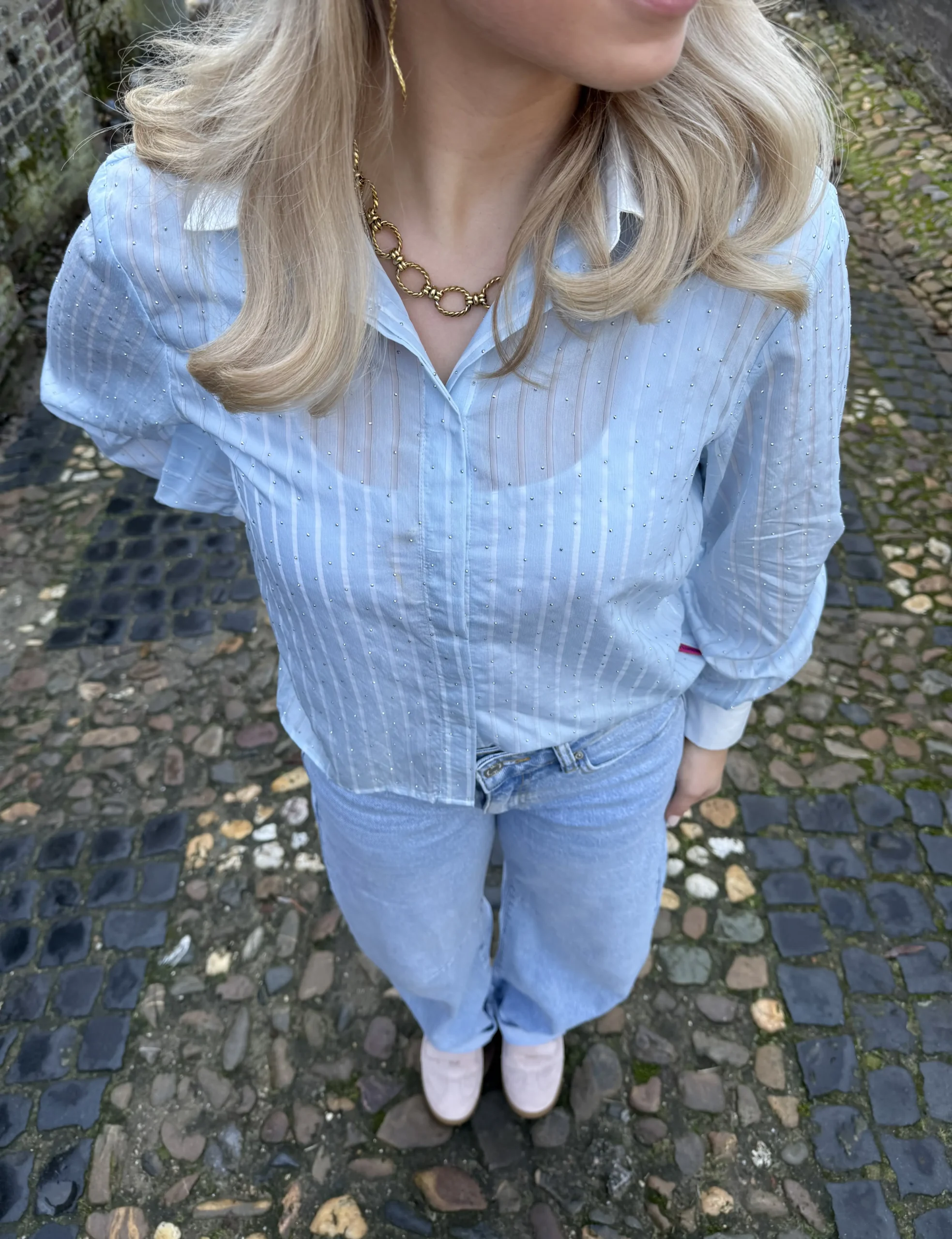 De Maelle Blouse van Fluresk is classy met een twist. Het sierlijke kraagje, de wijde manchetten en de subtiele glitterdetails geven deze blouse een vrouwelijke en speelse uitstraling. Dankzij de verfijnde afwerking is dit een item dat zowel overdag als ’s avonds straalt. Draag ’m casual chic op een jeans of combineer met een rok voor een meer geklede look. Tijdloos, met precies dat vleugje fun.