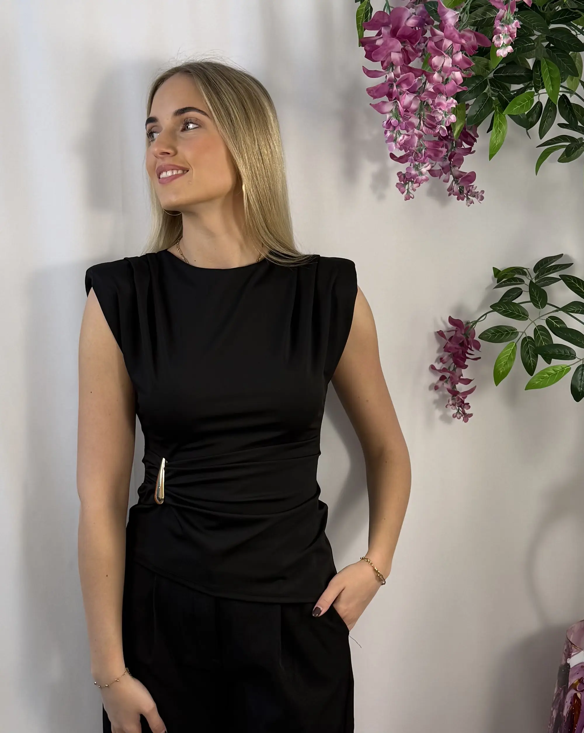 Isa top is een stijlvolle top in een zwarte kleur met een prachtig goud detail. Dit subtiele accent geeft het item direct een elegante en verfijnde uitstraling. Dankzij de comfortabele stretchstof draagt de top prettig en is hij perfect te combineren met een jeans, rok of pantalon voor een chique maar moeiteloze look.