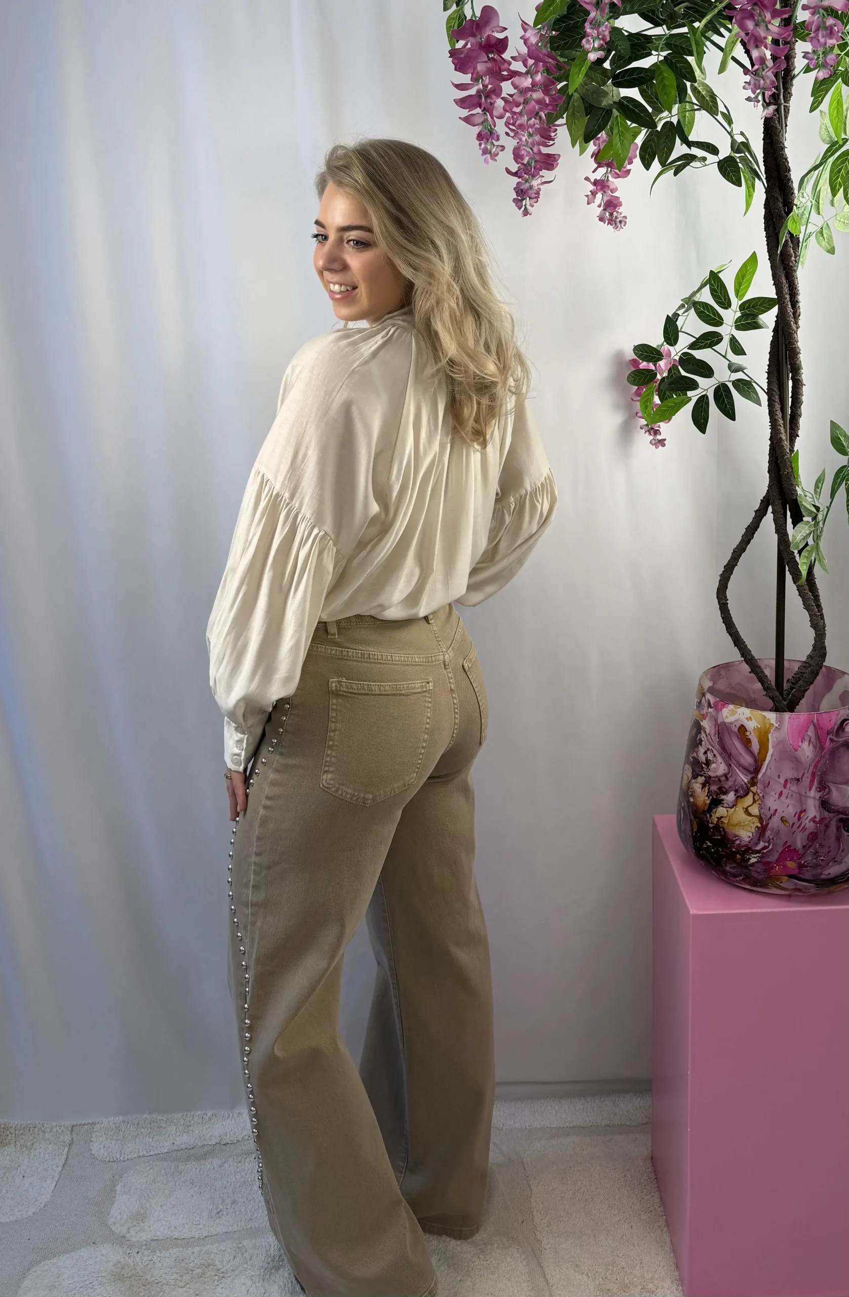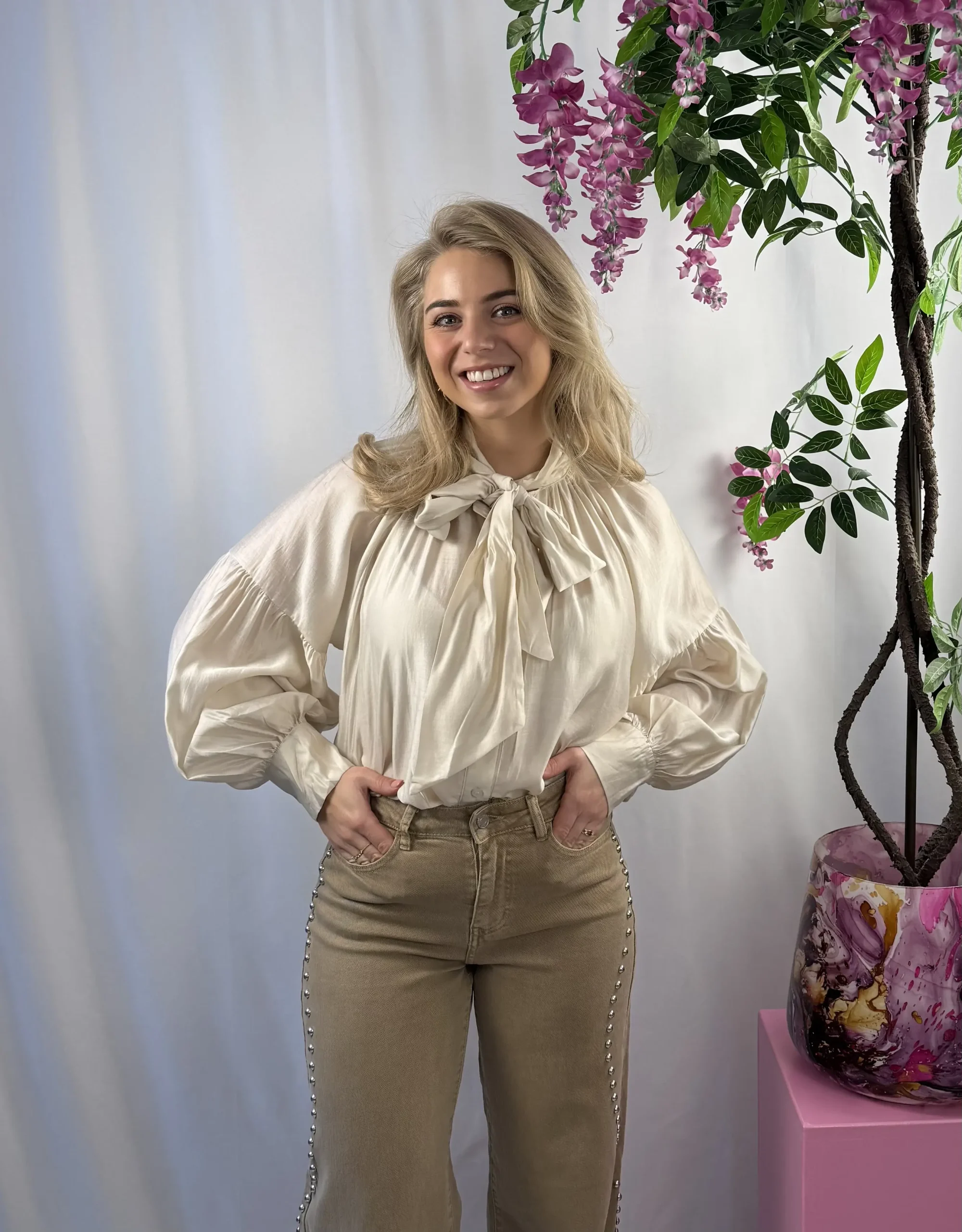 Isabel blouse is een prachtige beige blouse met een luchtige, losvallende stof die zorgt voor een elegante en vrouwelijke uitstraling. Het strikdetail op de voorkant kun je zelf knopen, wat een speels en verfijnd accent geeft. De mooie details op de losvallende mouwen maken deze blouse extra bijzonder. Een veelzijdig item dat je eindeloos kunt combineren voor zowel een casual als geklede look.