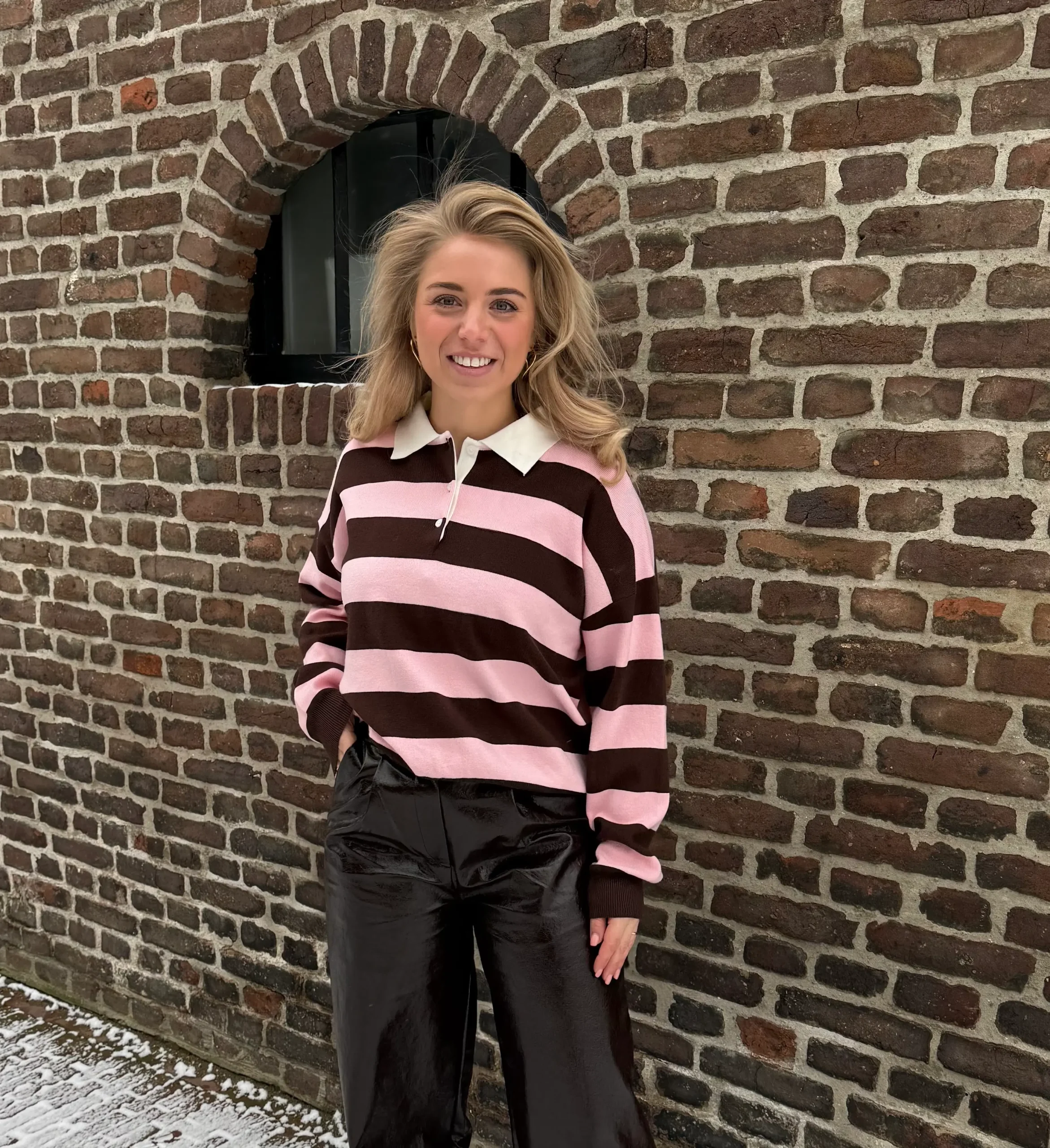 Polo sweater met bruine en roze strepen – comfortabel, trendy & seizoensproof
