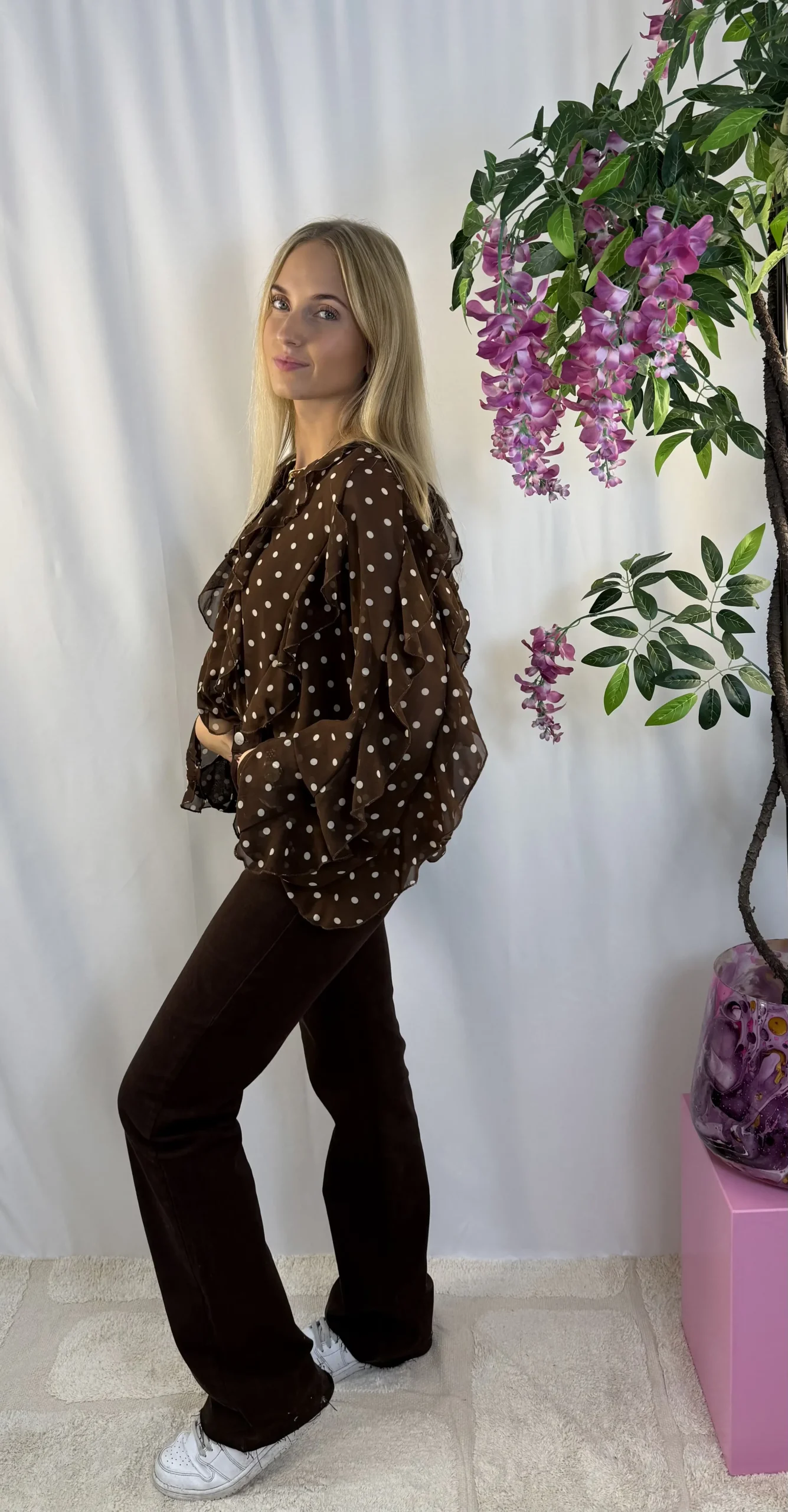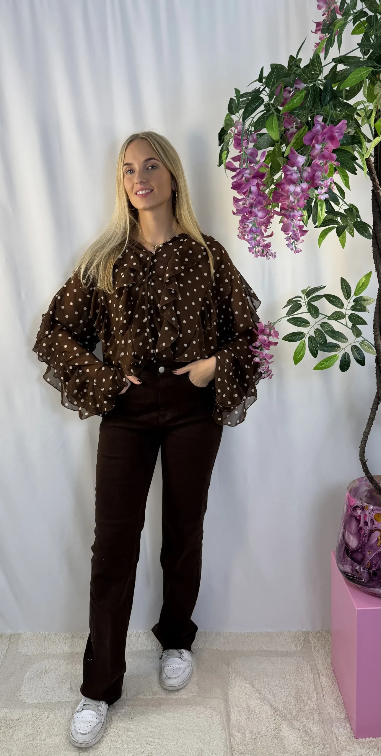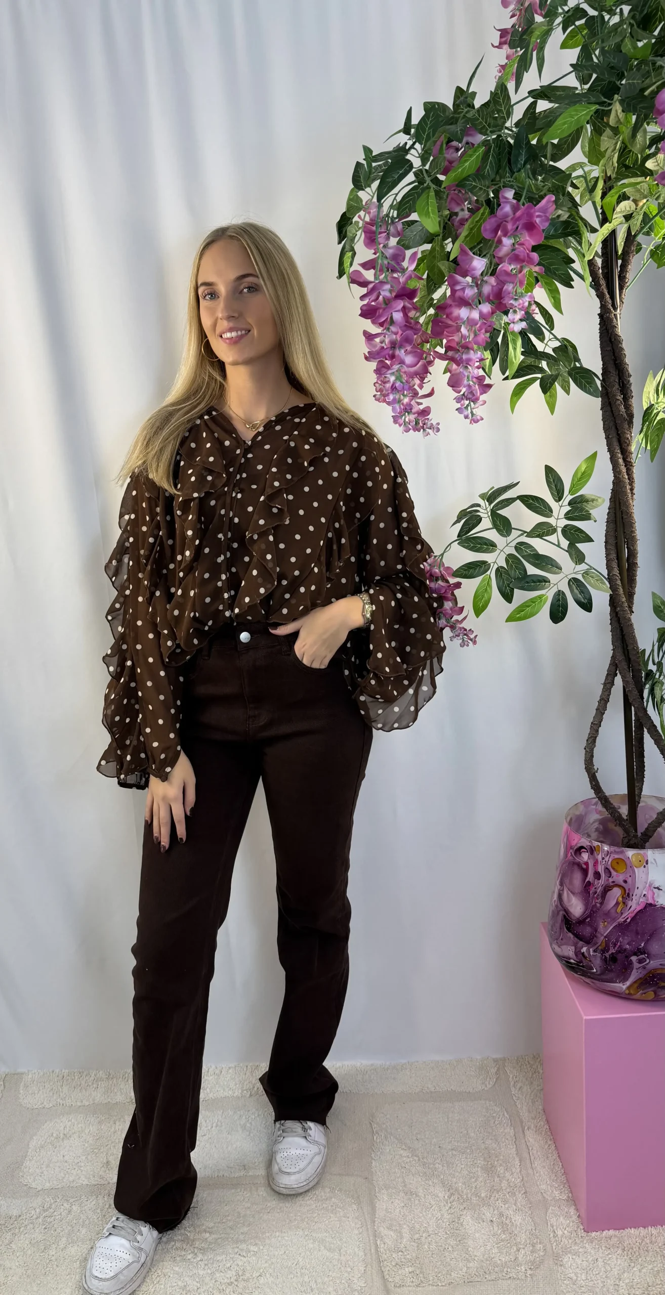 Deze bruine blouse met crèmekleurige stippen is een absolute must-have voor dit seizoen! De dot trend is helemaal in, en deze blouse combineert het perfect met vrouwelijke ruffles voor een speelse, elegante uitstraling. De blouse valt lekker ruim en is gemaakt van een lichte, luchtige stof – comfortabel én stijlvol voor zowel werk als vrije tijd.