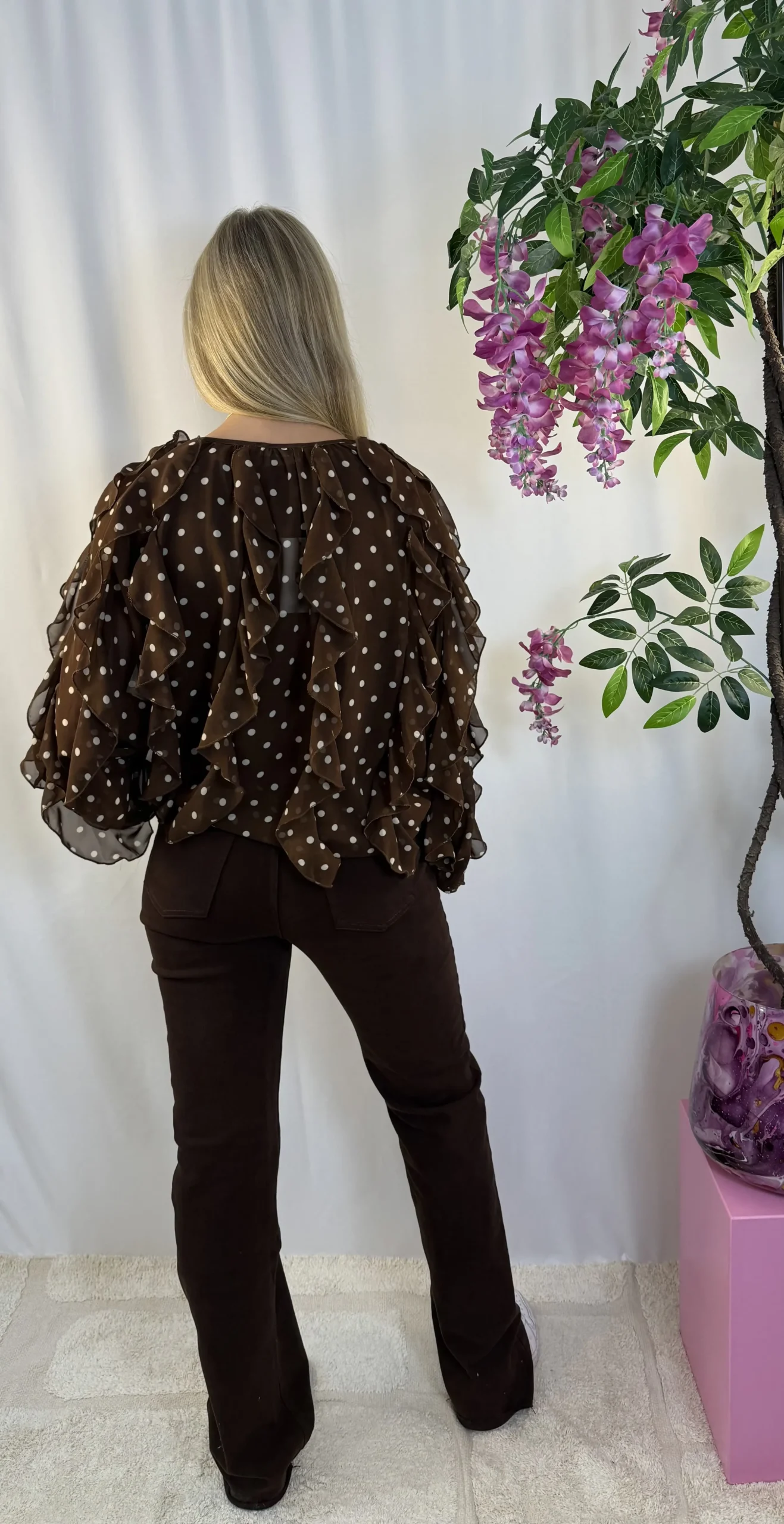 Bruine Blouse met Crèmekleurige Stippen – Met Ruffles & Luchtige Pasvorm