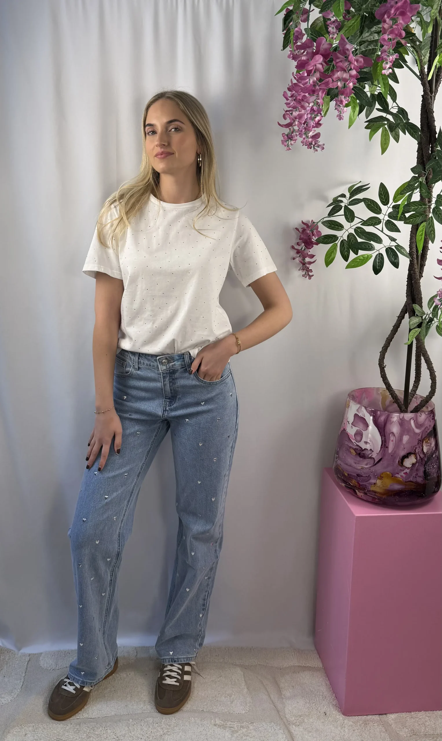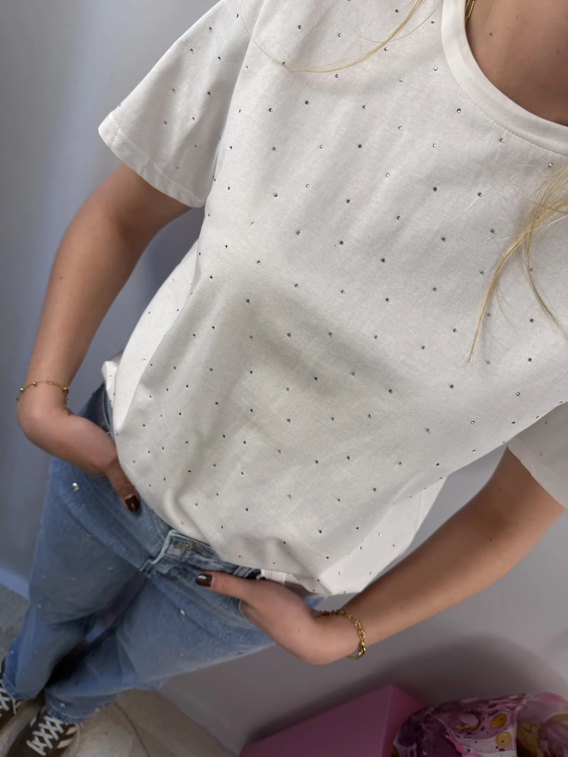 Lizzy spark T-shirt is een wit T-shirt met gekleurde steentjes die zorgen voor een opvallende uitstraling. De subtiele sparkle geeft dit item net dat beetje extra, terwijl de katoenen stof heerlijk comfortabel draagt. Perfect om je outfit een trendy touch te geven.