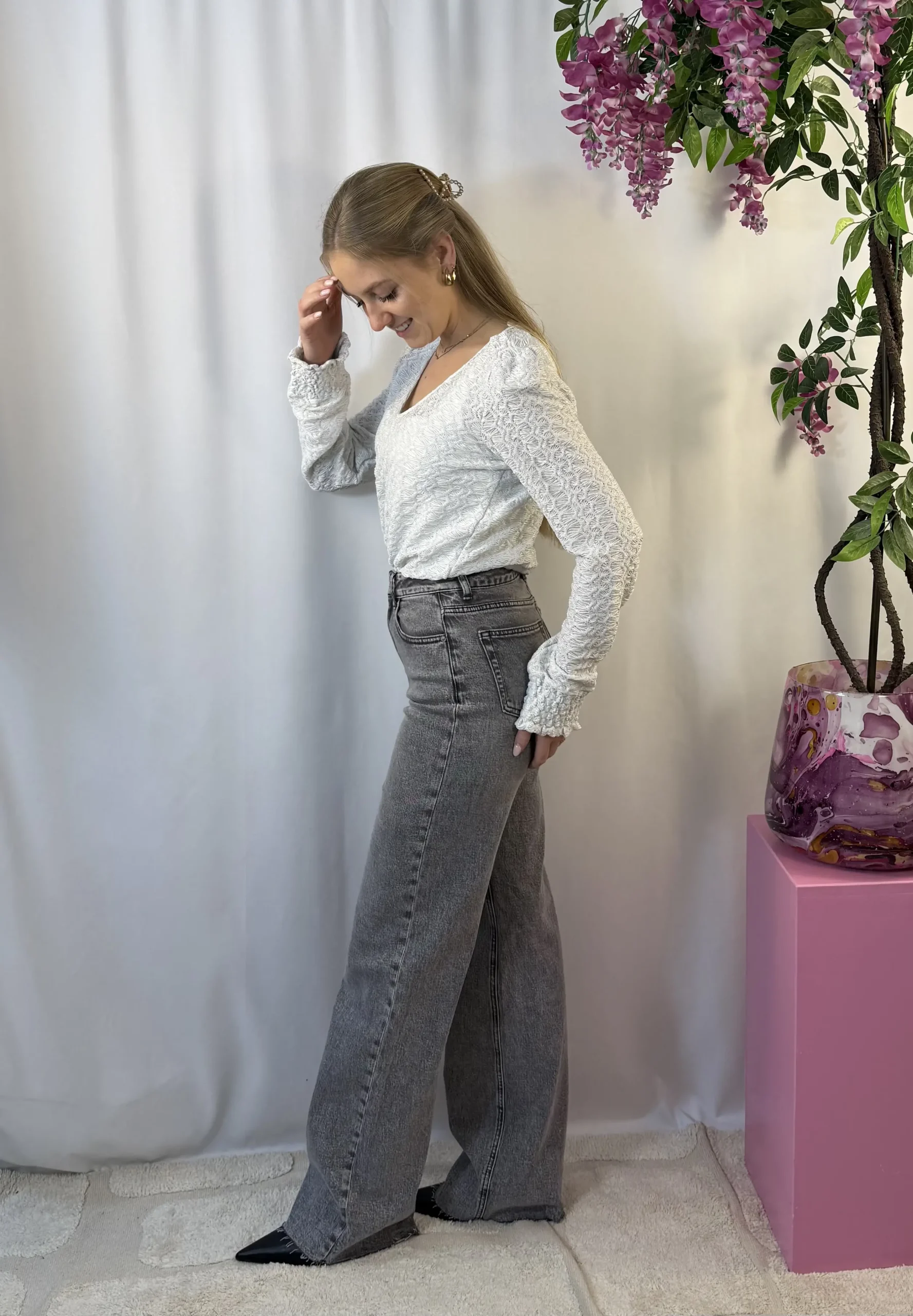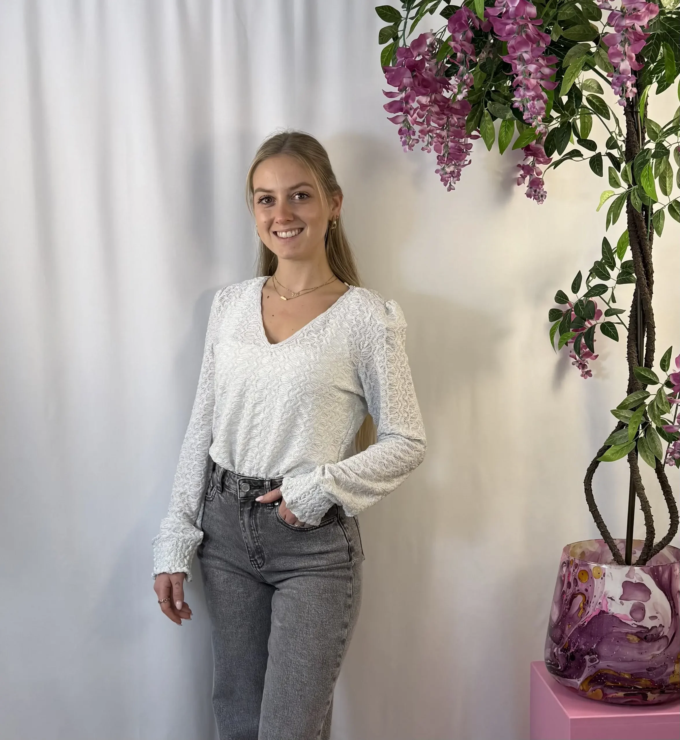 Blouse Harlow is een elegante witte blouse met een vrouwelijke V-hals en stijlvolle pofmouwen. De stof heeft een subtiele glans die zorgt voor een luxe uitstraling. Dankzij de losvallende pasvorm draagt de blouse comfortabel en flatteert hij elk figuur. Perfect voor een chique werklook, maar ook ideaal te combineren voor een avondje uit met een mooie pantalon of rok.