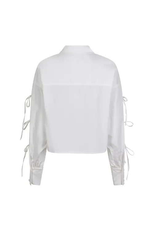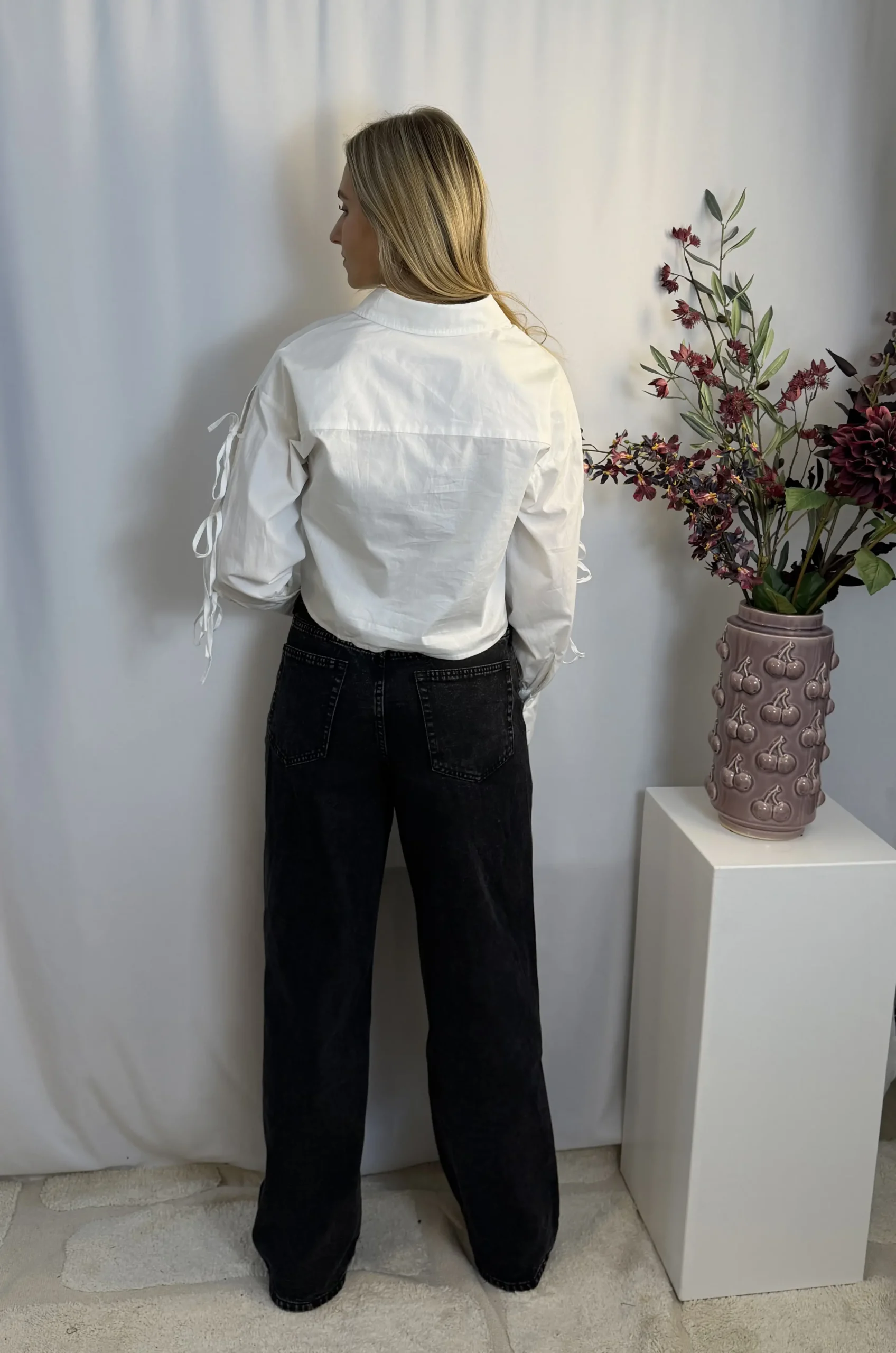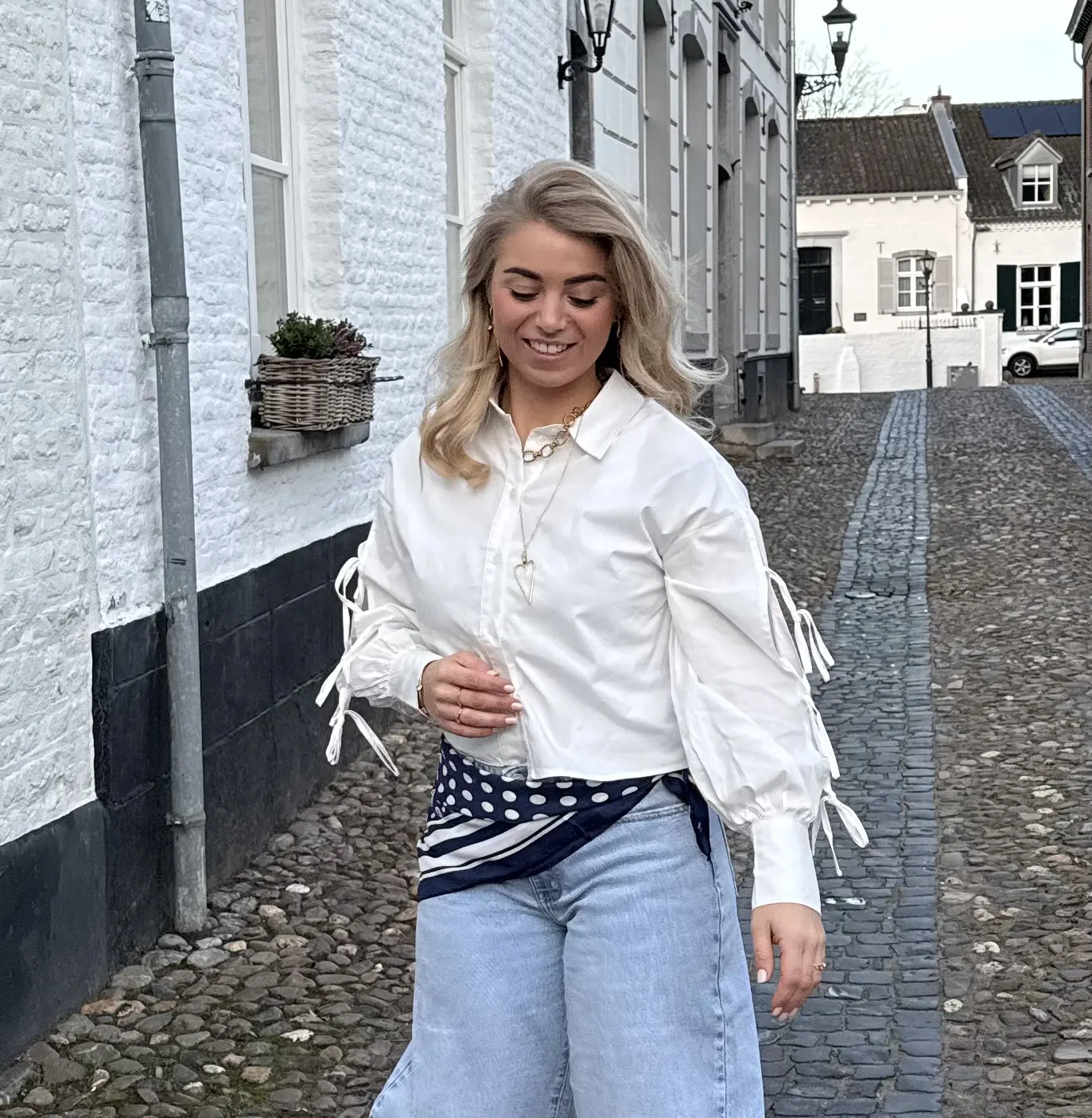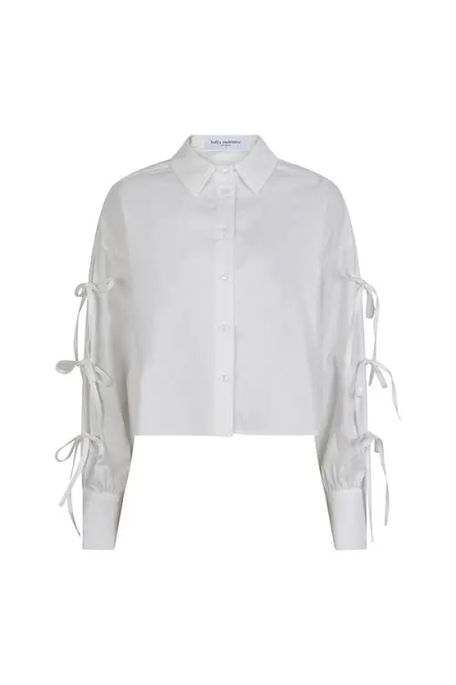 Blouse Rosy is een prachtige witte cropped blouse van Lofty Manner. De blouse heeft een klassieke kraag en een elegante knoopsluiting aan de voorkant. De strikdetails bij de mouwen geven dit item een vrouwelijke, speelse touch, terwijl de losvallende pasvorm zorgt voor een comfortabele en stijlvolle look. Perfect om te combineren met een high waisted broek, rok of skort.
