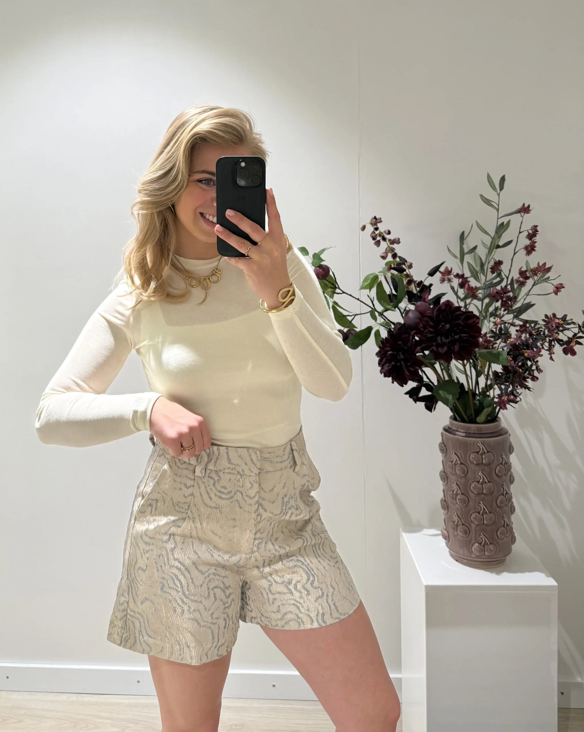 Short Ninou van Lofty Manner is een stijlvolle zilveren short met een luxe en opvallende uitstraling. De jacquard stof met patroon geeft dit item extra karakter, terwijl de rechte pijpen zorgen voor een moderne en flatterende fit. Perfect om te combineren met een blouse, top of blazer voor een trendy en verfijnde look.