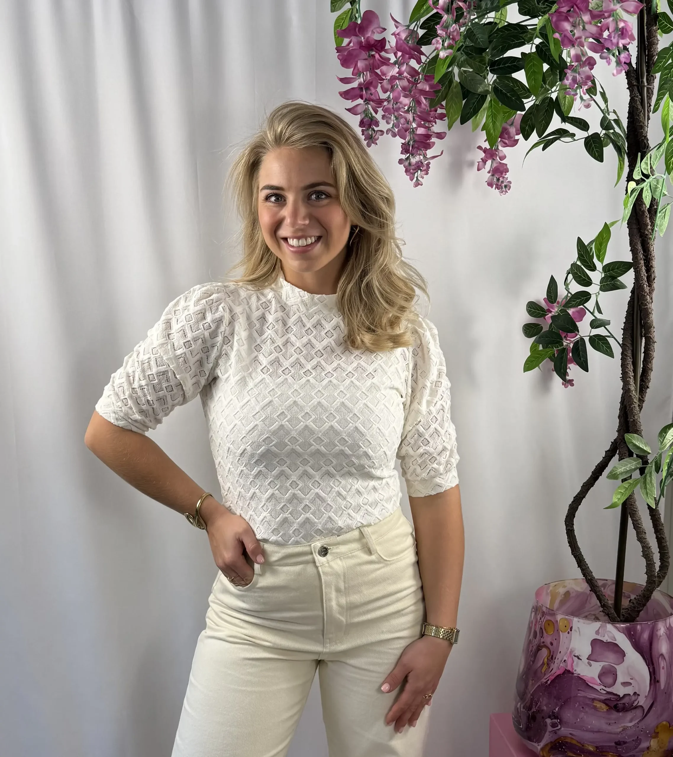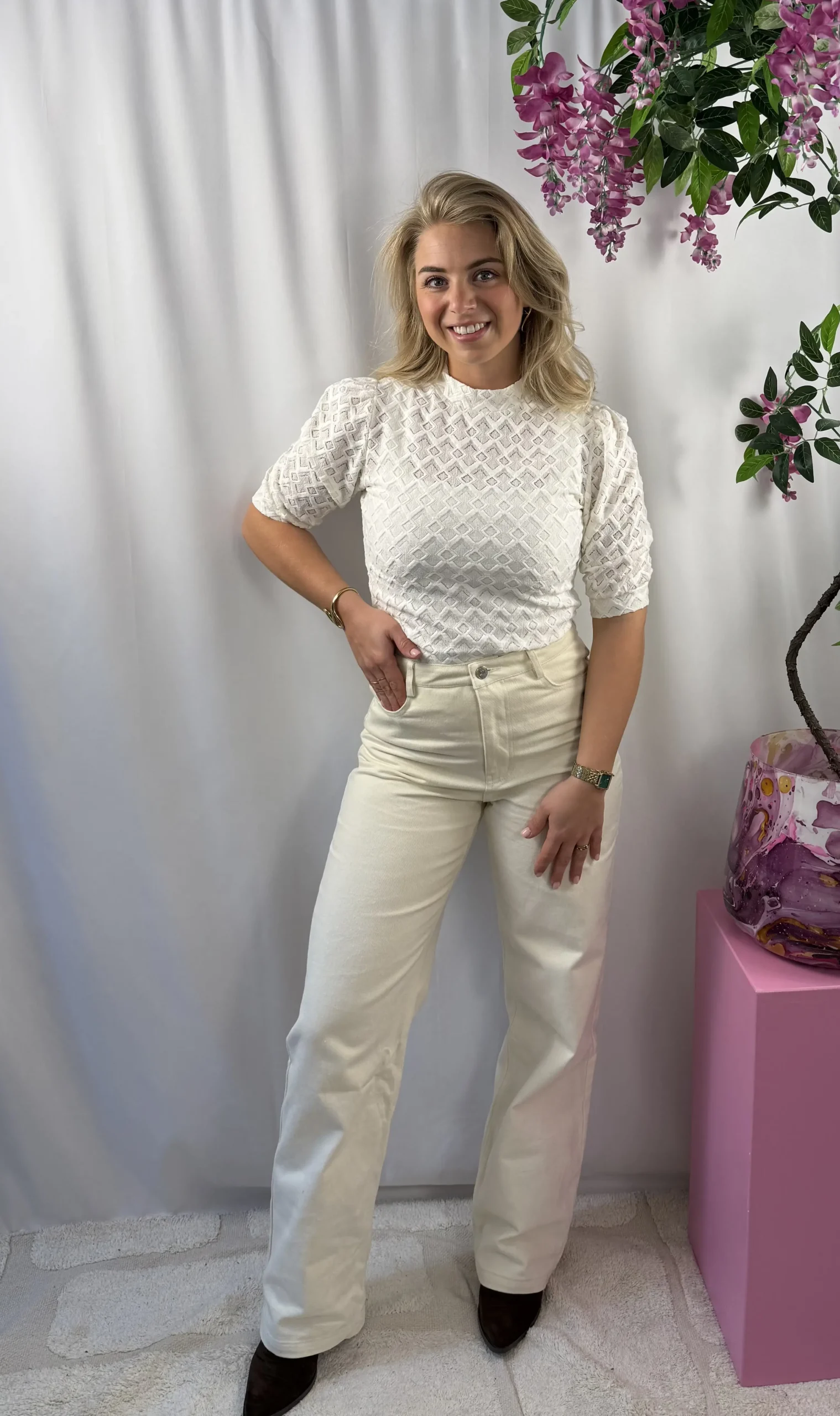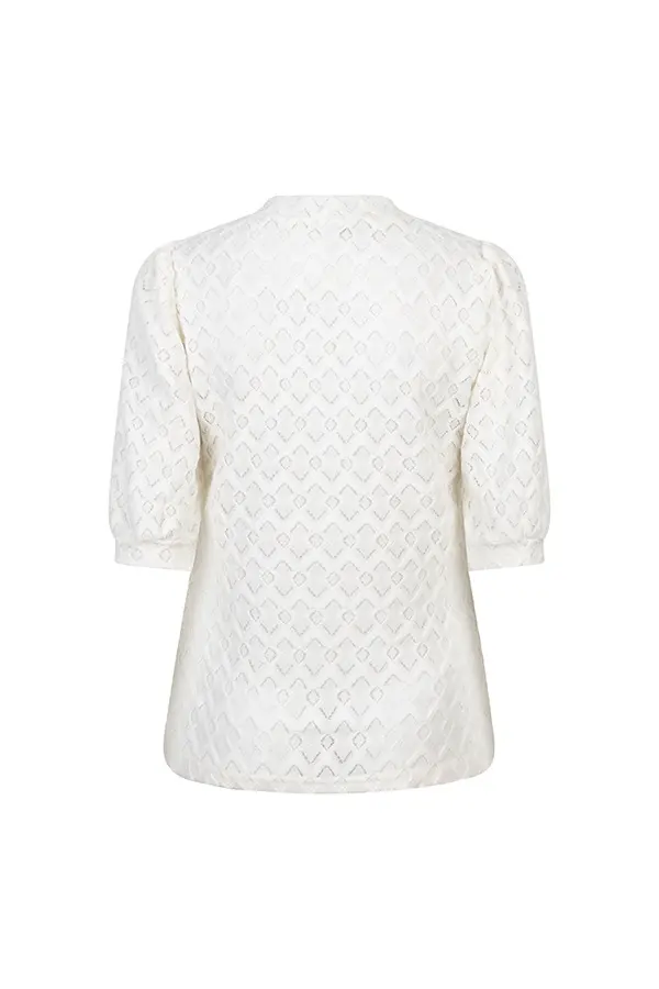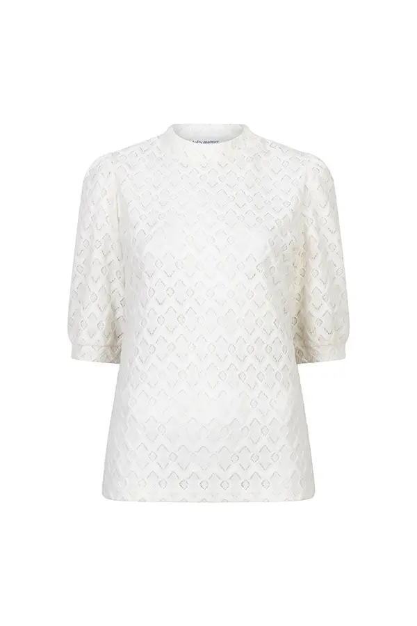 Top Mire van Lofty Manner is een stijlvolle ecru top met korte mouwen en een rond openstaande hals voor een elegante uitstraling. De subtiele pofmouwen geven een vrouwelijke touch, terwijl de aangesloten pasvorm mooi aansluit en zorgt voor een flatterend silhouet. Perfect om te combineren met zowel een jeans als een rok of pantalon voor een veelzijdige look.