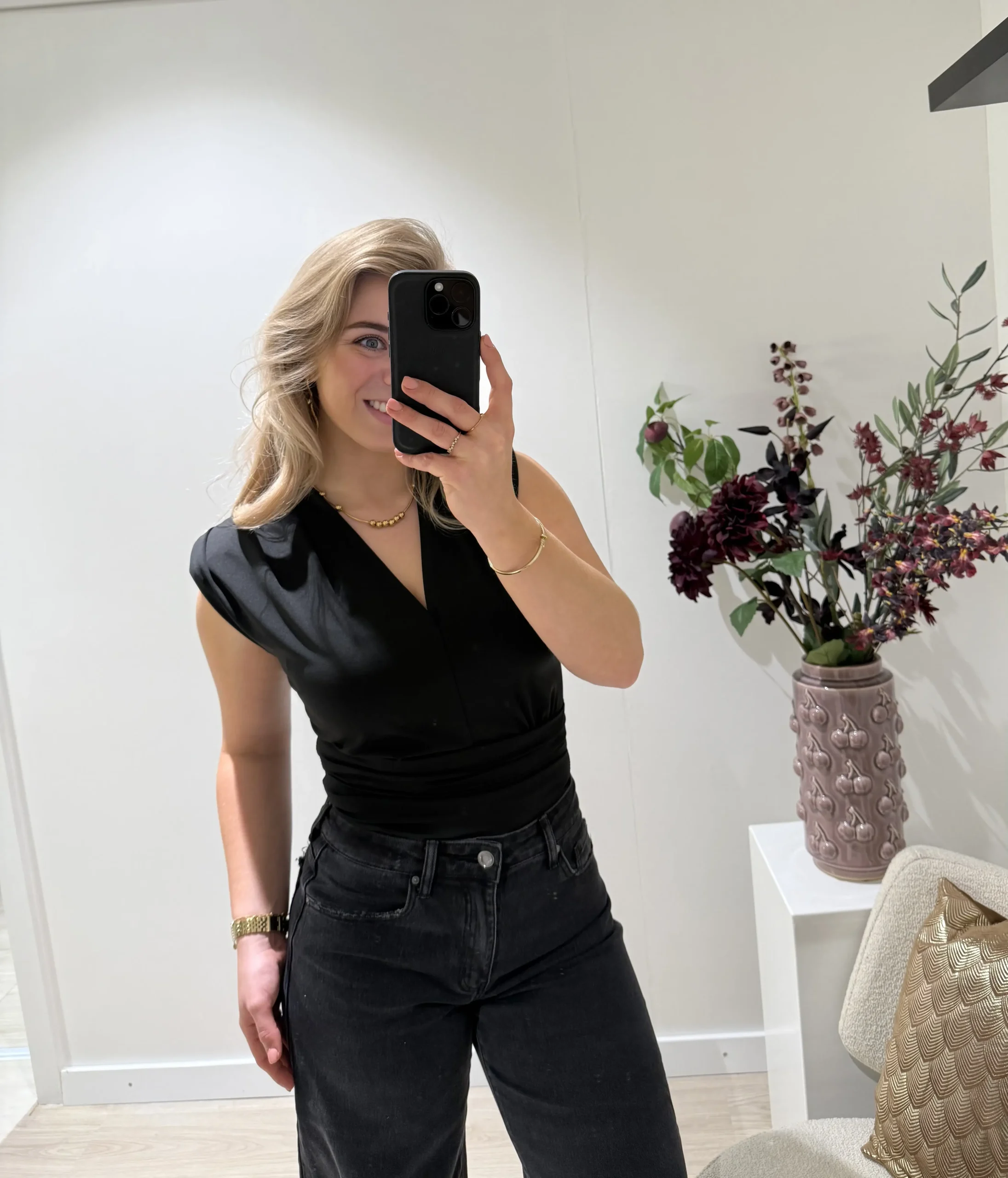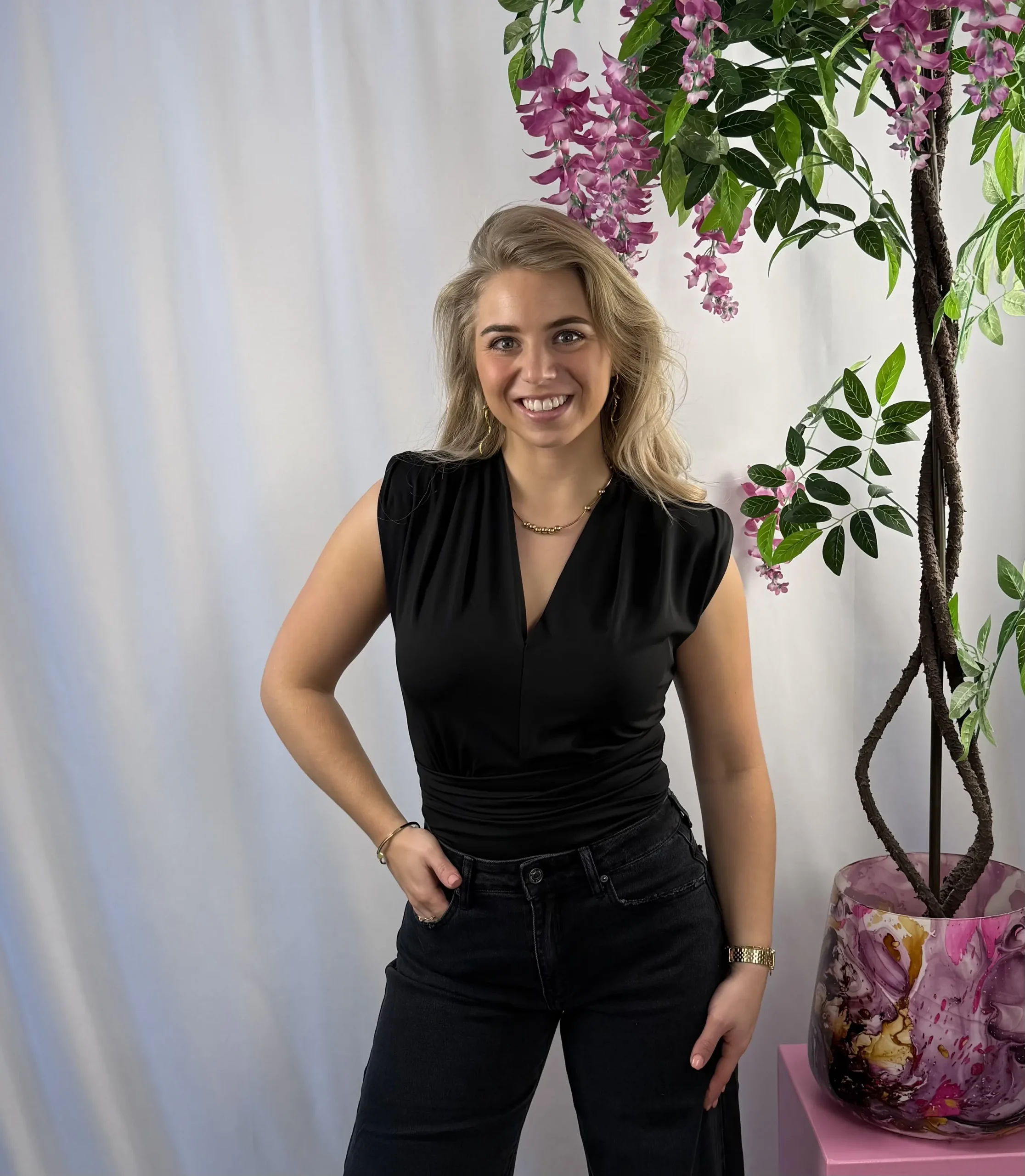 Deze prachtige body met V-hals sluit mooi aan en geeft een elegante, vrouwelijke uitstraling. De subtiele schoudervulling zorgt voor een verfijnd silhouet en maakt dit item extra stijlvol. Een veelzijdige body die je eindeloos kunt combineren, perfect voor zowel een casual als geklede look.