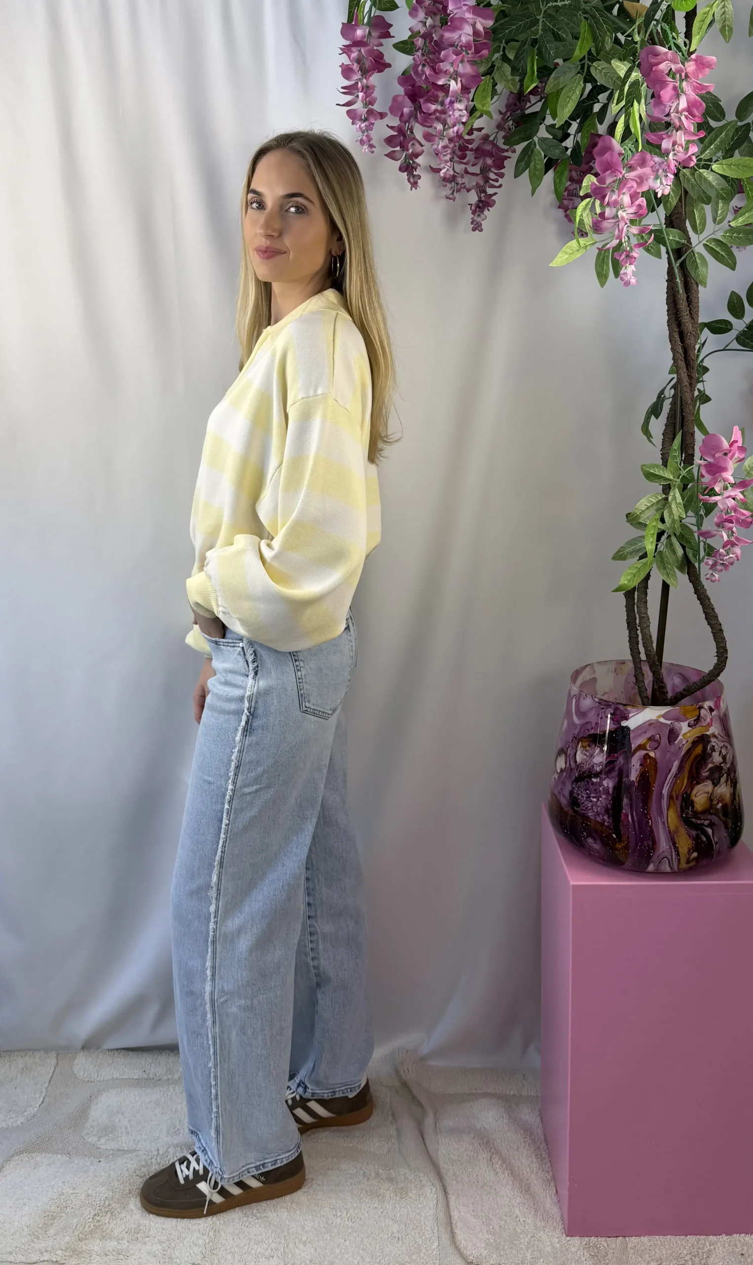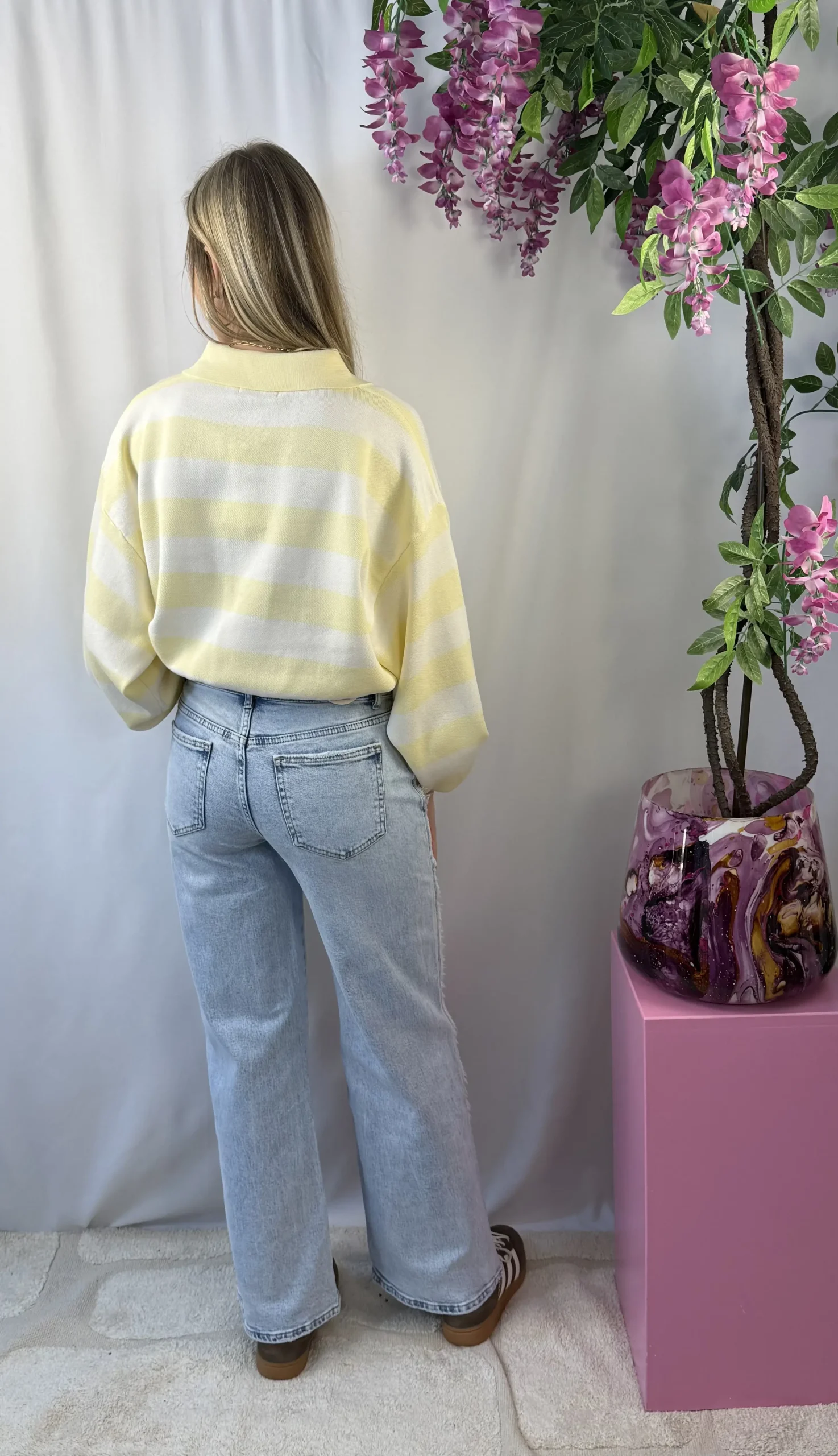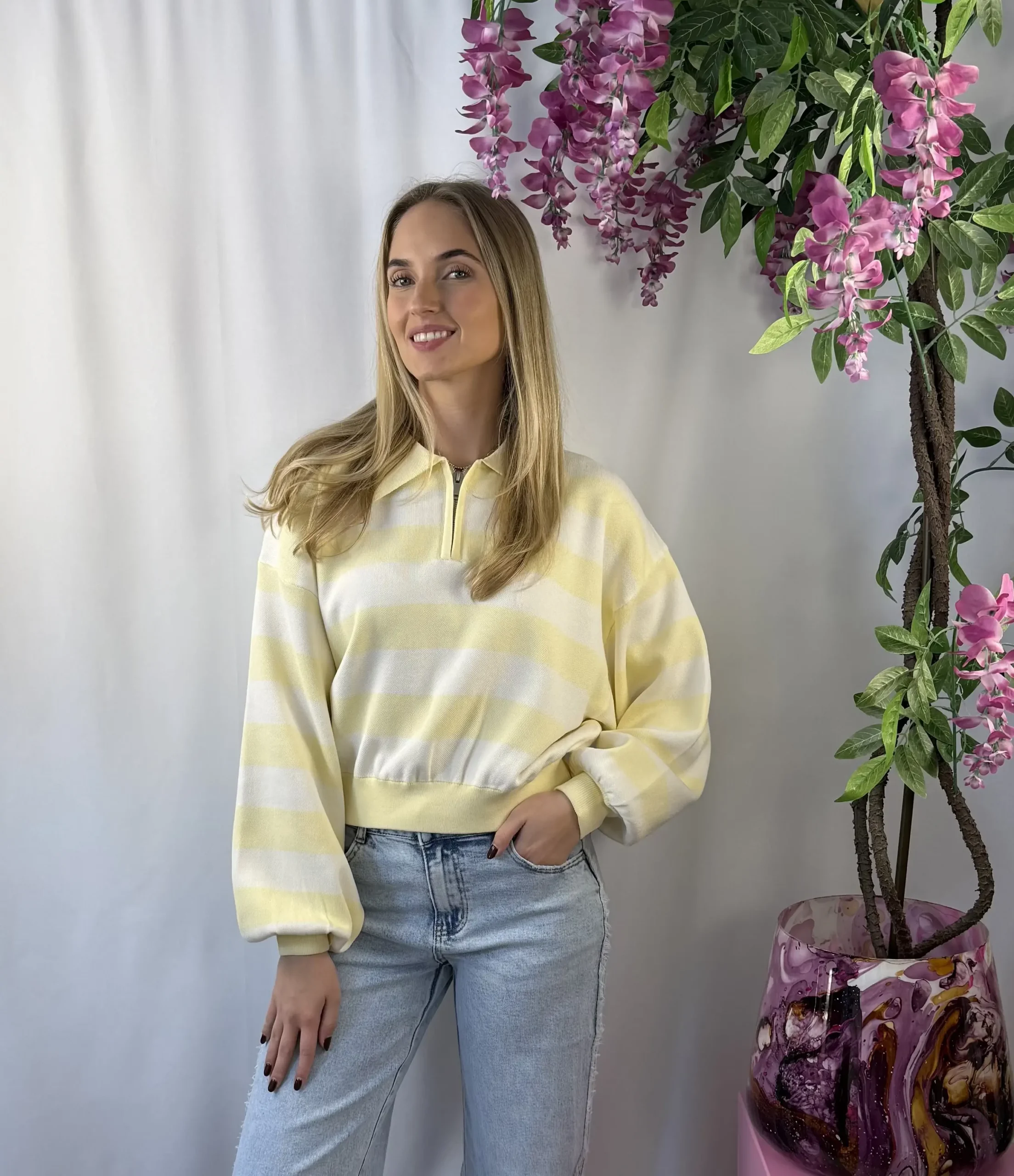 Melina sweater is een frisse, gestreepte sweater in de kleuren wit en zacht geel. De lichte kleurcombinatie geeft dit item een zachte en vrouwelijke uitstraling, perfect voor het voorjaar. Dankzij de soepele stof draagt de sweater comfortabel en is hij ideaal om te combineren met een jeans, pantalon of rok voor een casual maar stijlvolle look.