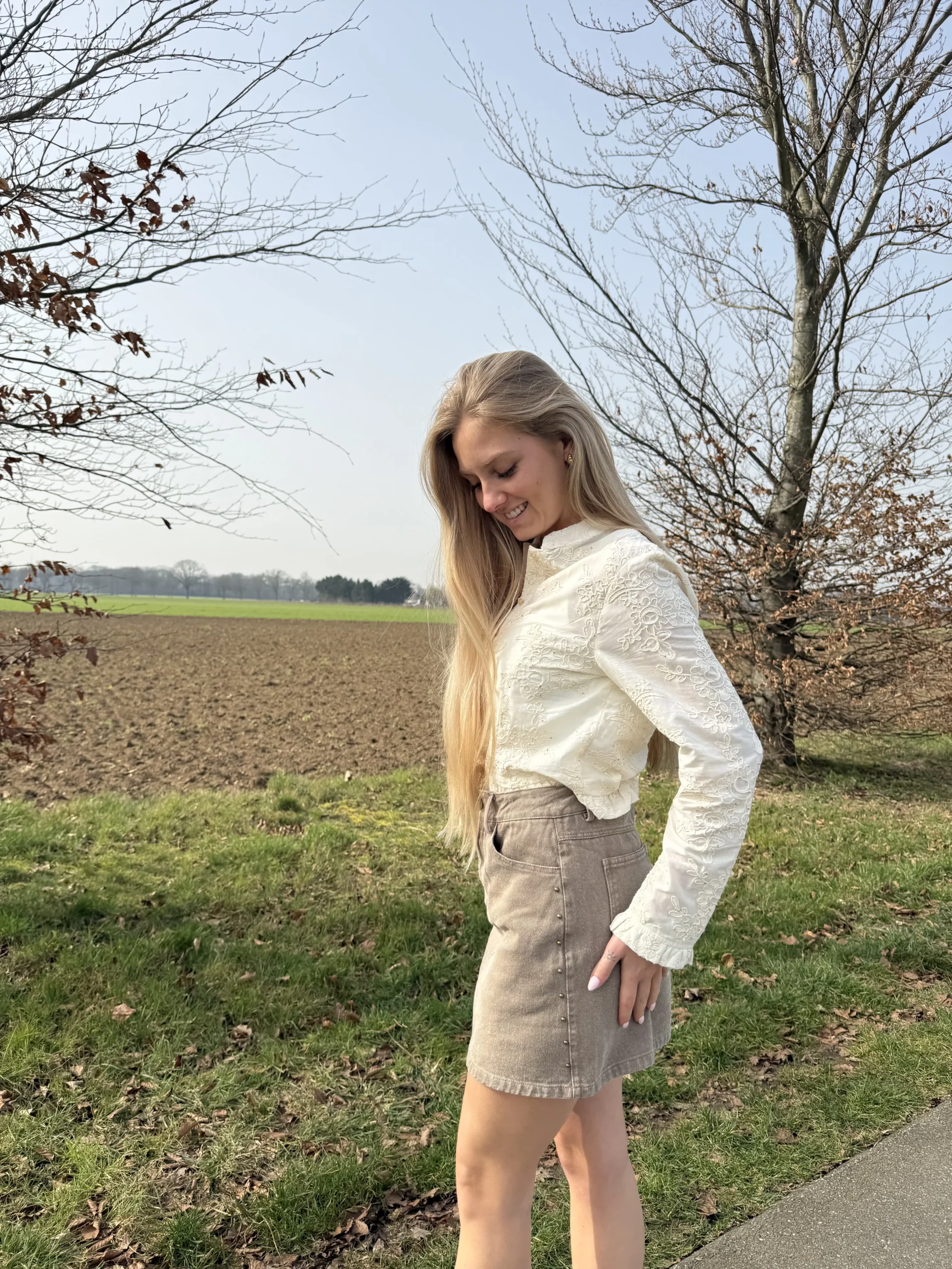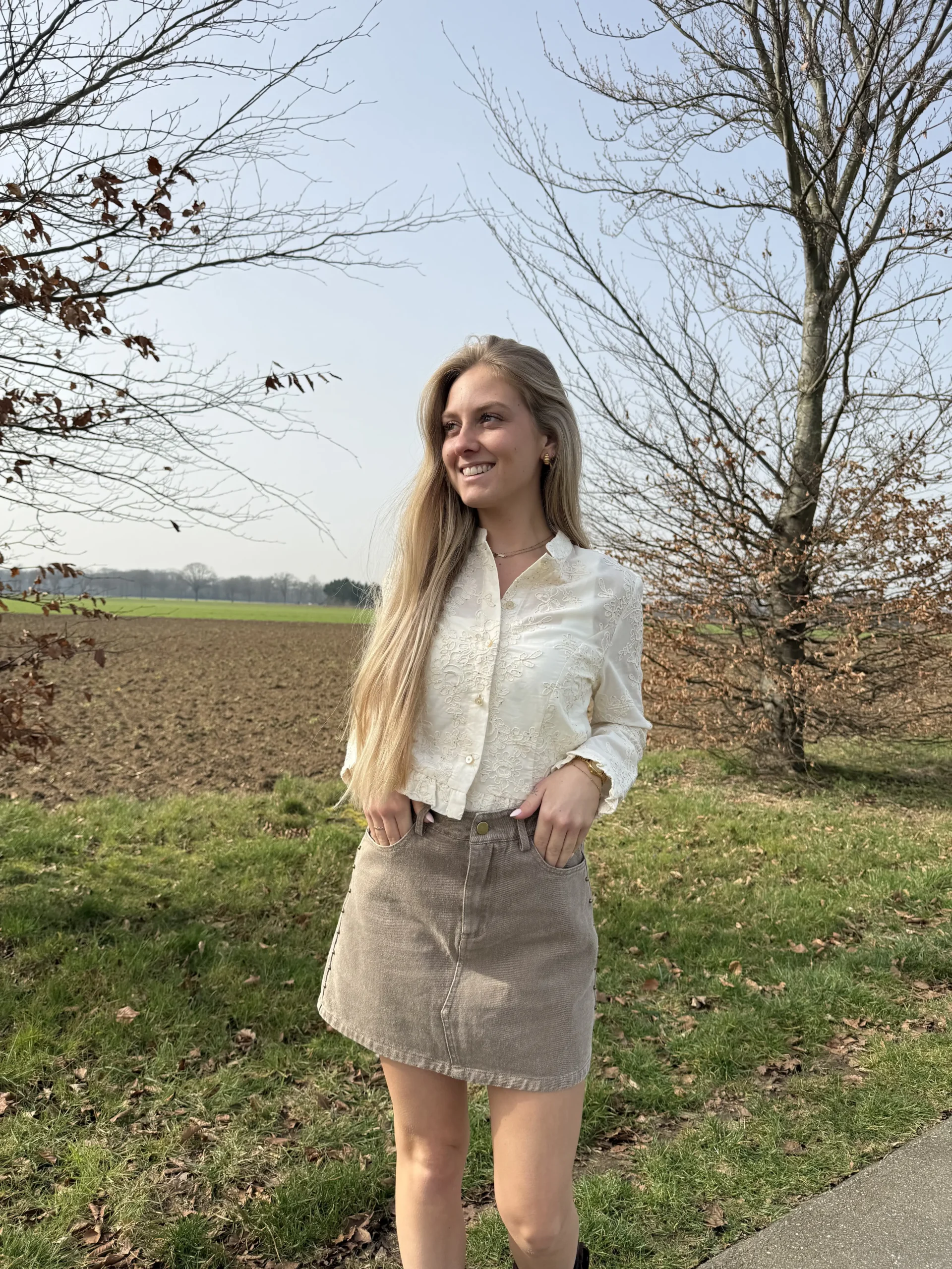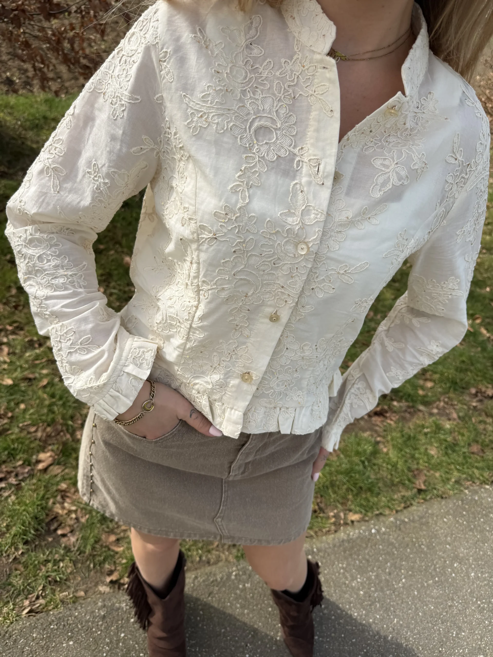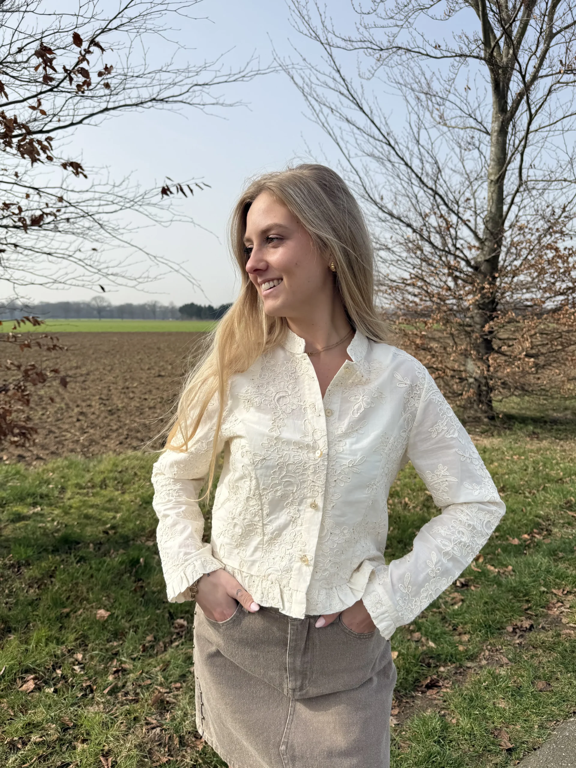 Mira blouse is een stijlvolle beige blouse met bijzondere gestikte details en subtiele glitters verspreid over de stof. Deze combinatie geeft de blouse een elegante, maar speelse uitstraling. Dankzij de katoenen stof draagt het item heerlijk comfortabel en is het perfect te combineren met zowel een jeans als een rok of pantalon.