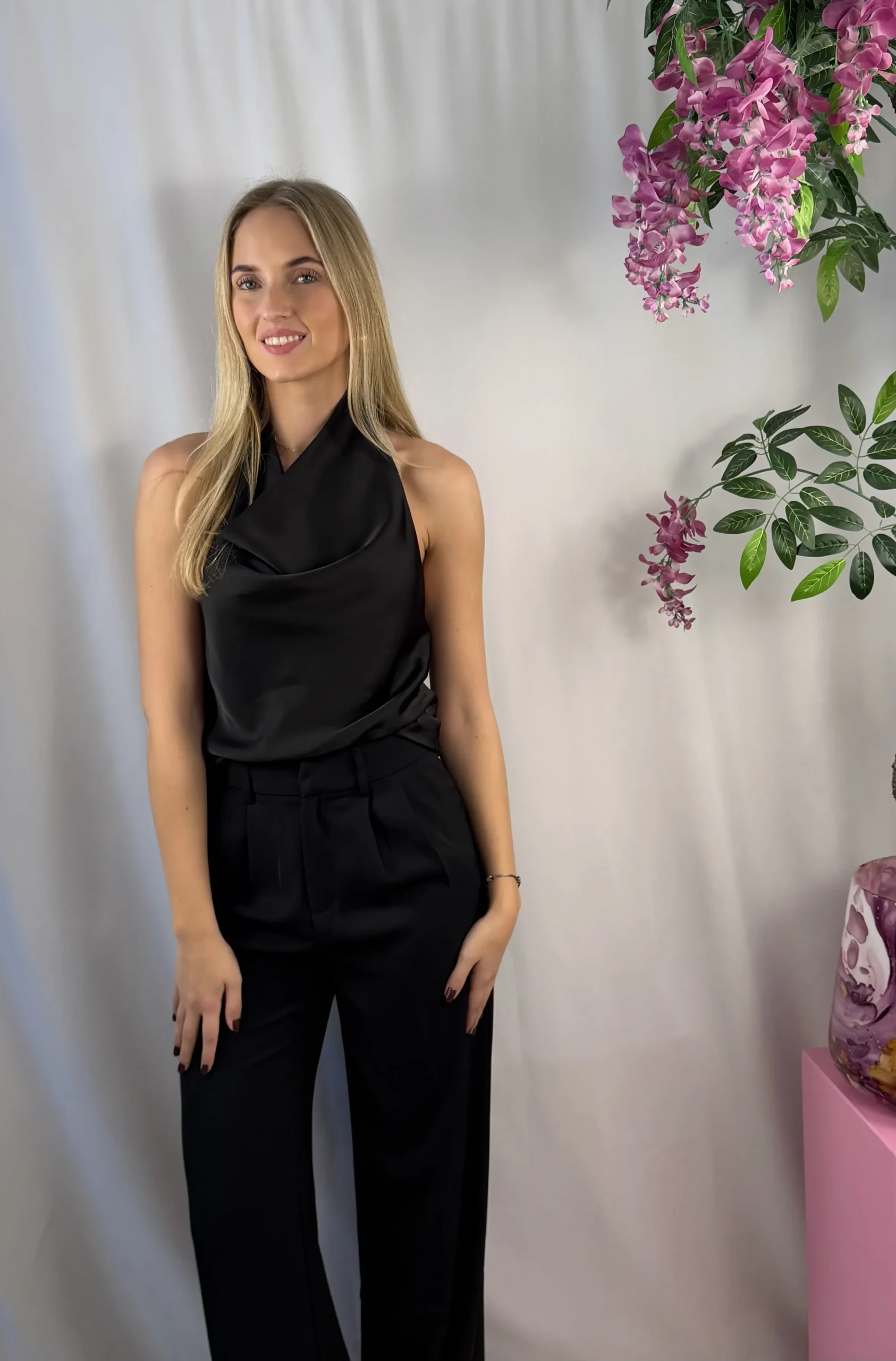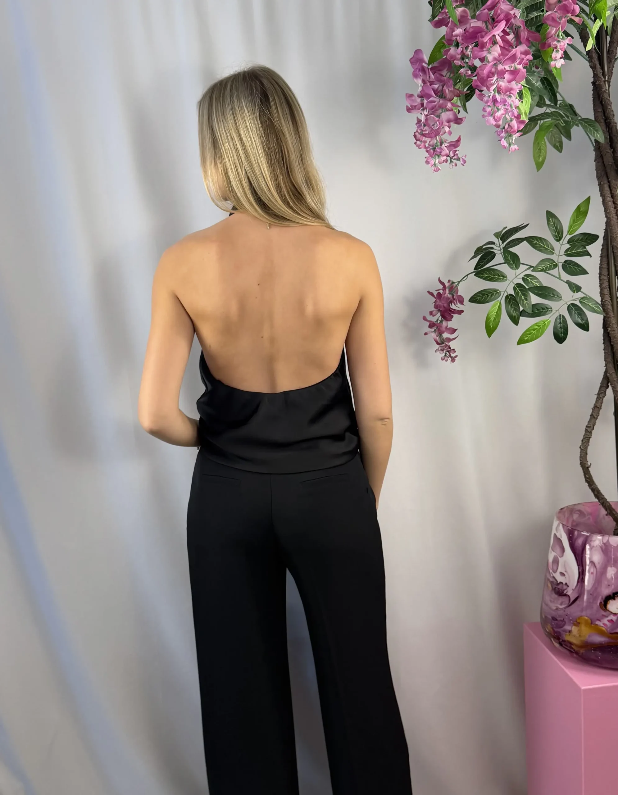 De zwarte satijnen halter top is prachtig te combineren met een pantalon, rok of jeans voor een chique en tijdloze look.