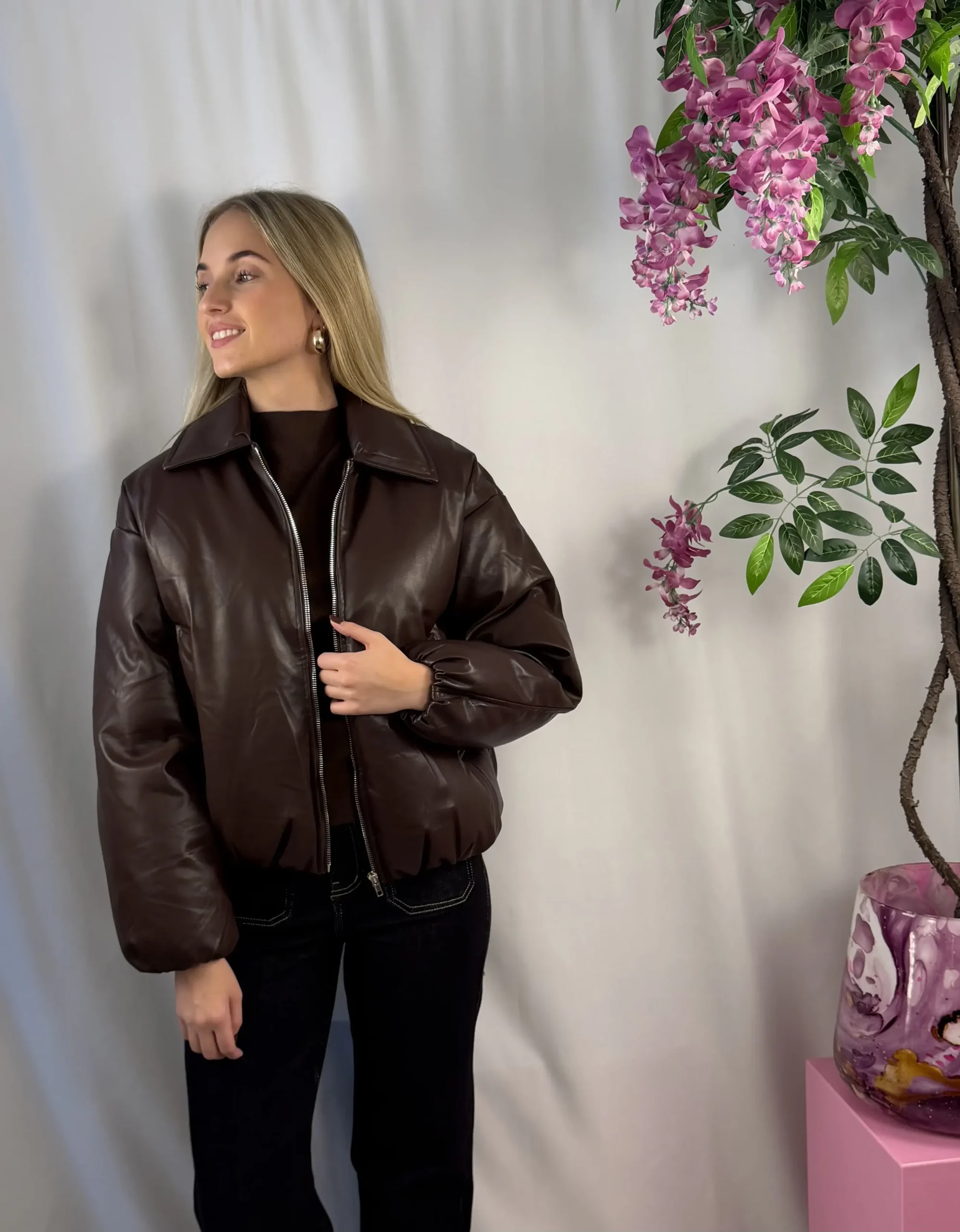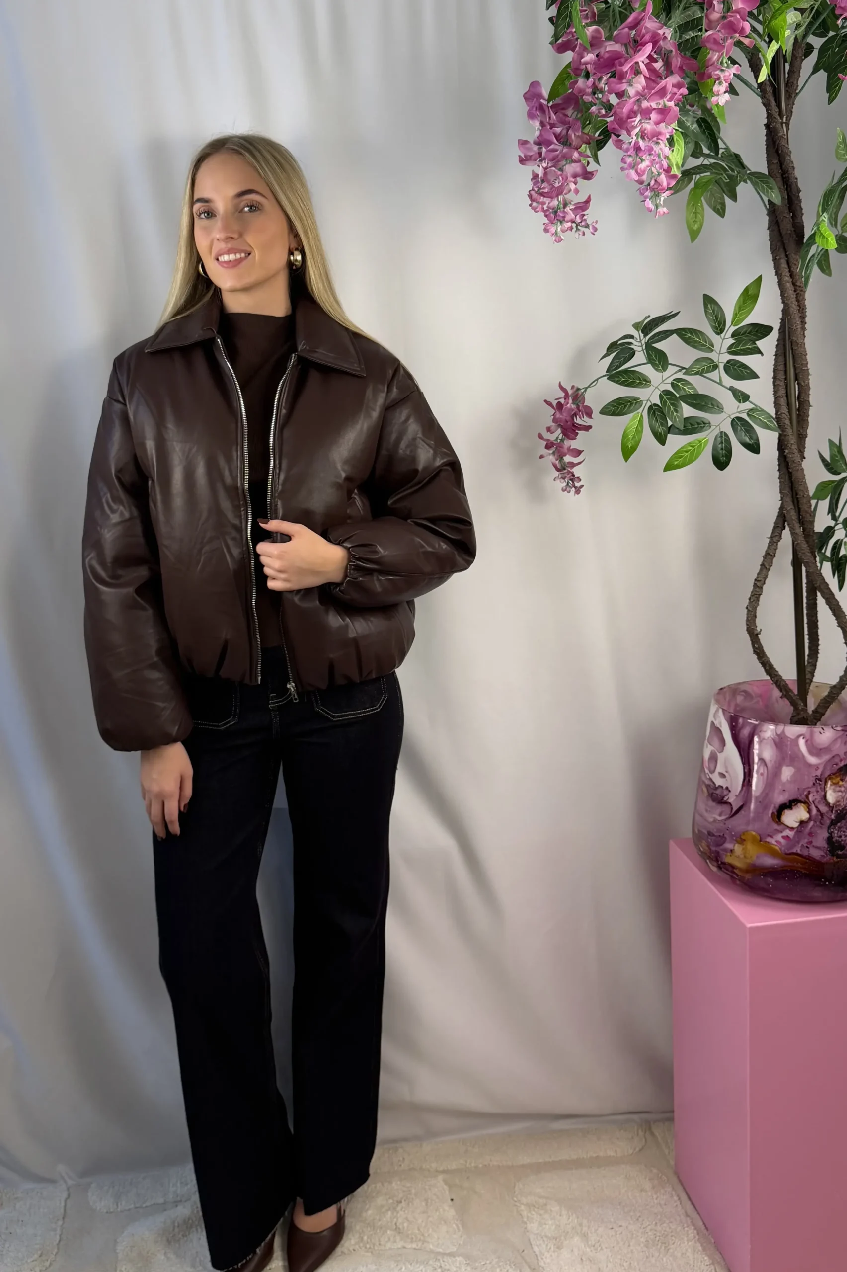 Deze prachtige bruine leather look coat is een echte musthave voor de winter. De jas heeft een stoere uitstraling door het leather look materiaal en een comfortabele fit dankzij de elastieke band aan de onderkant, wat zorgt voor een subtiel puffer effect. De mooie kraag en de praktische zakken maken de jas niet alleen stijlvol, maar ook super functioneel voor dagelijks gebruik. Een warme én trendy winterjas die elke outfit naar een hoger niveau tilt.