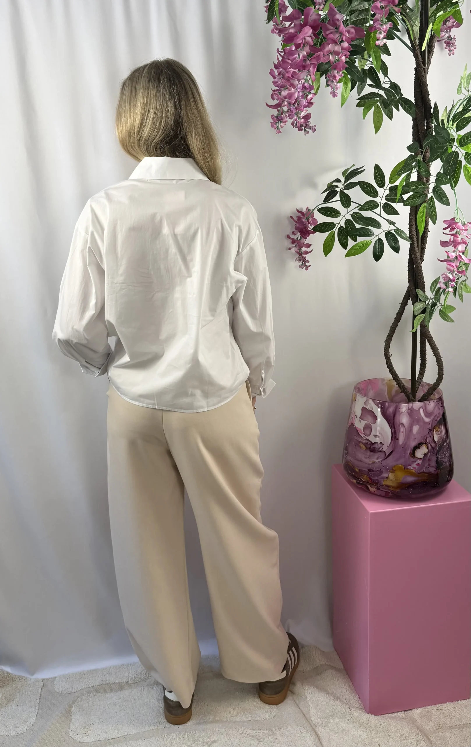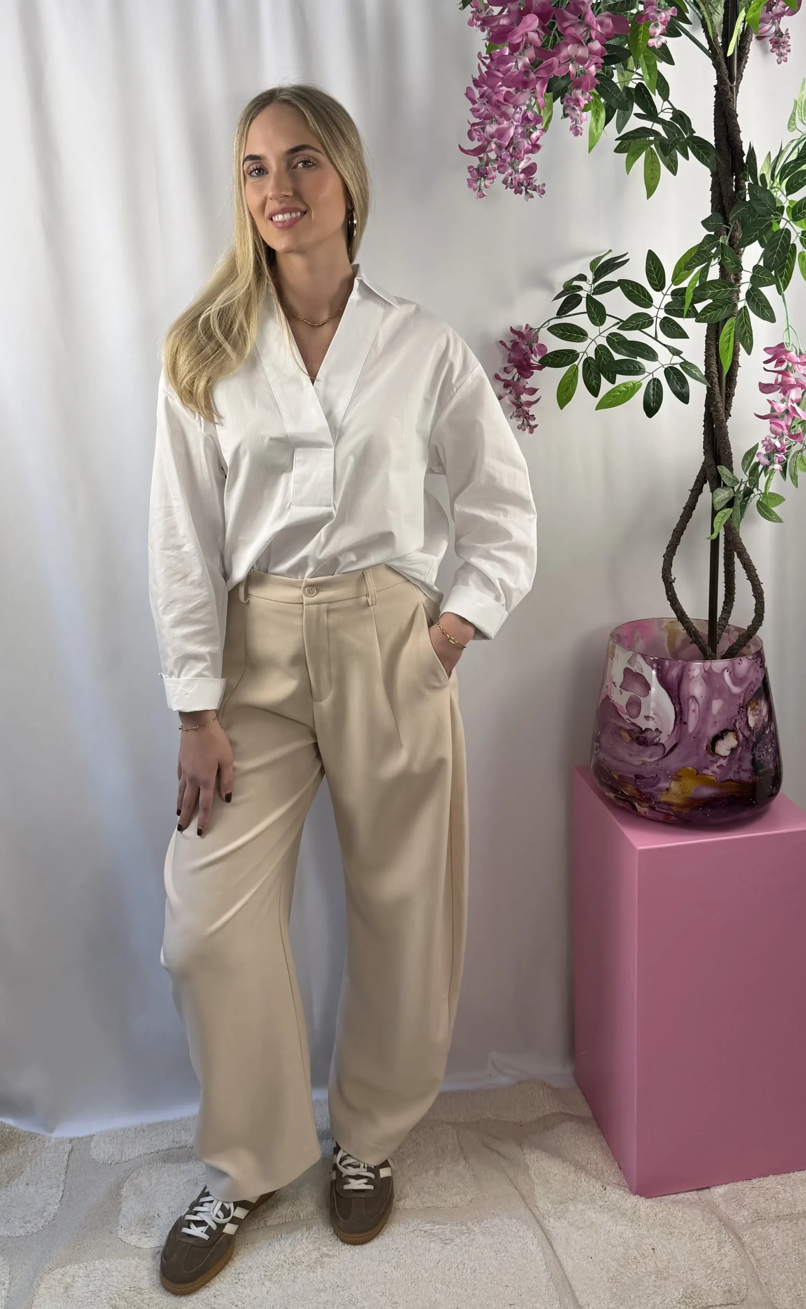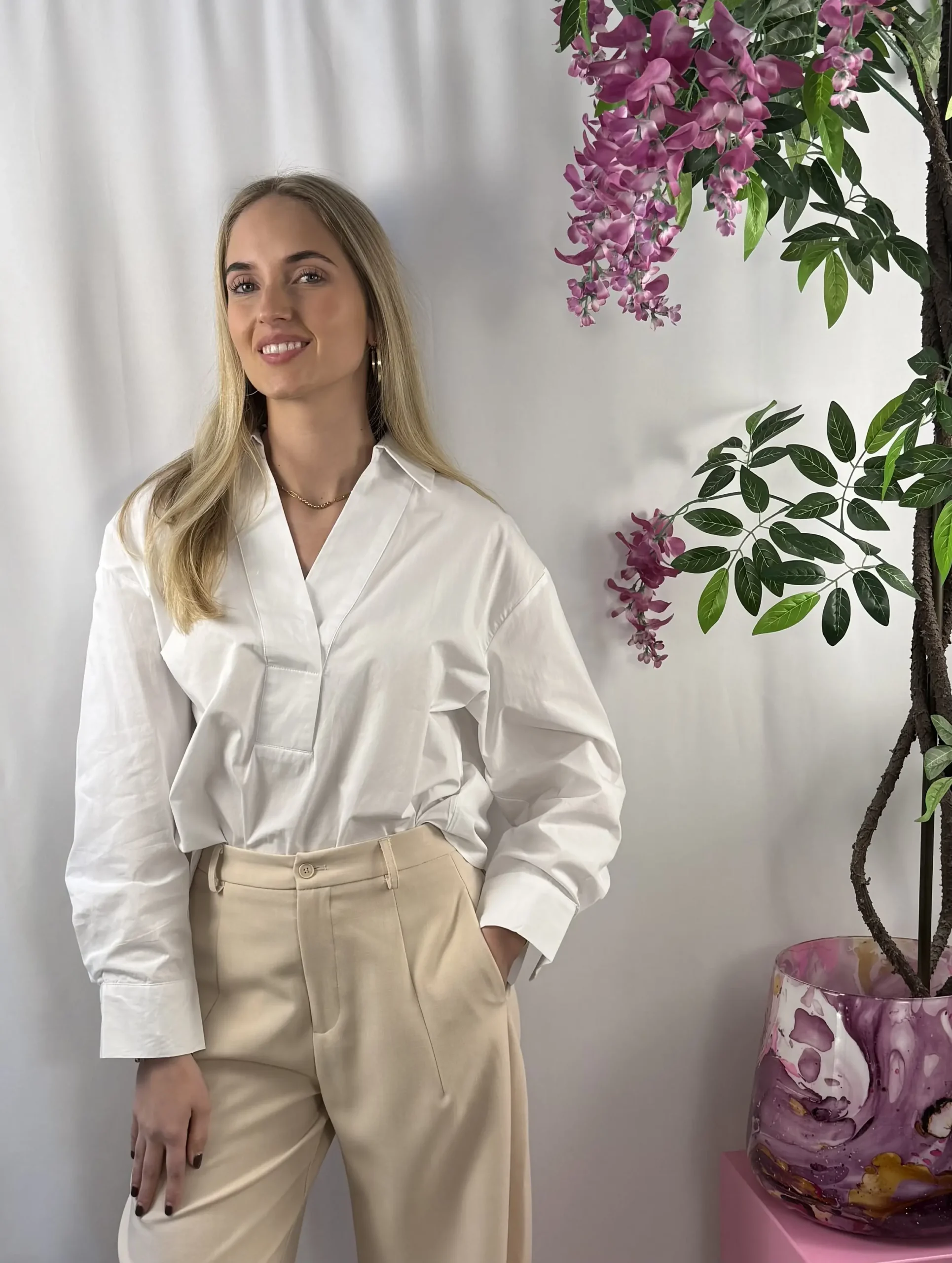 Nina blouse is een stijlvolle witte blouse met een elegante V-hals. De combinatie van het cleane design en de luchtige katoenen stof zorgt voor een tijdloze en vrouwelijke uitstraling. Perfect om zowel casual te dragen op een jeans als chic te combineren met een rok of pantalon.