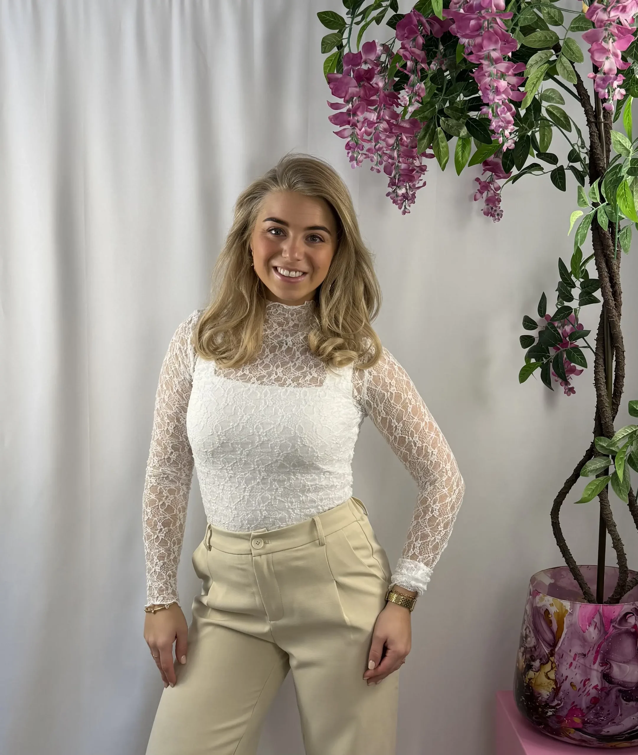 Deze prachtige witte lace top is een echte must-have basic met een chique twist. De top heeft een mooi colletje en is volledig aansluitend, waardoor hij prachtig het lichaam volgt. De kanten stof geeft een elegante en vrouwelijke uitstraling en maakt deze top perfect om los te dragen, maar ook ideaal als layering piece onder een blazer, sweater of gilet. Een item dat elke outfit net dat beetje extra geeft.