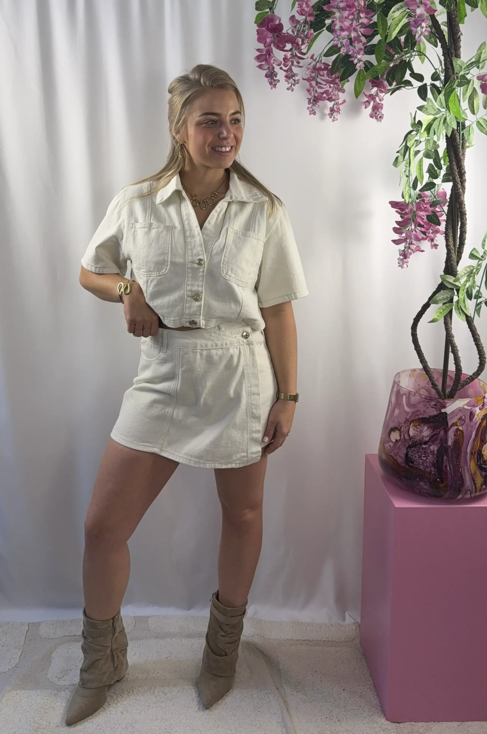 Novi denim blouse wit is een stijlvolle witte denim blouse met een trendy en vrouwelijke uitstraling. De blouse is afgewerkt met gouden knopen, wat zorgt voor een luxe en speelse touch. Dankzij het iets kortere model is dit item perfect te combineren met de bijpassende Novi denim skort, maar ook super leuk om los te dragen op een jeans of pantalon.