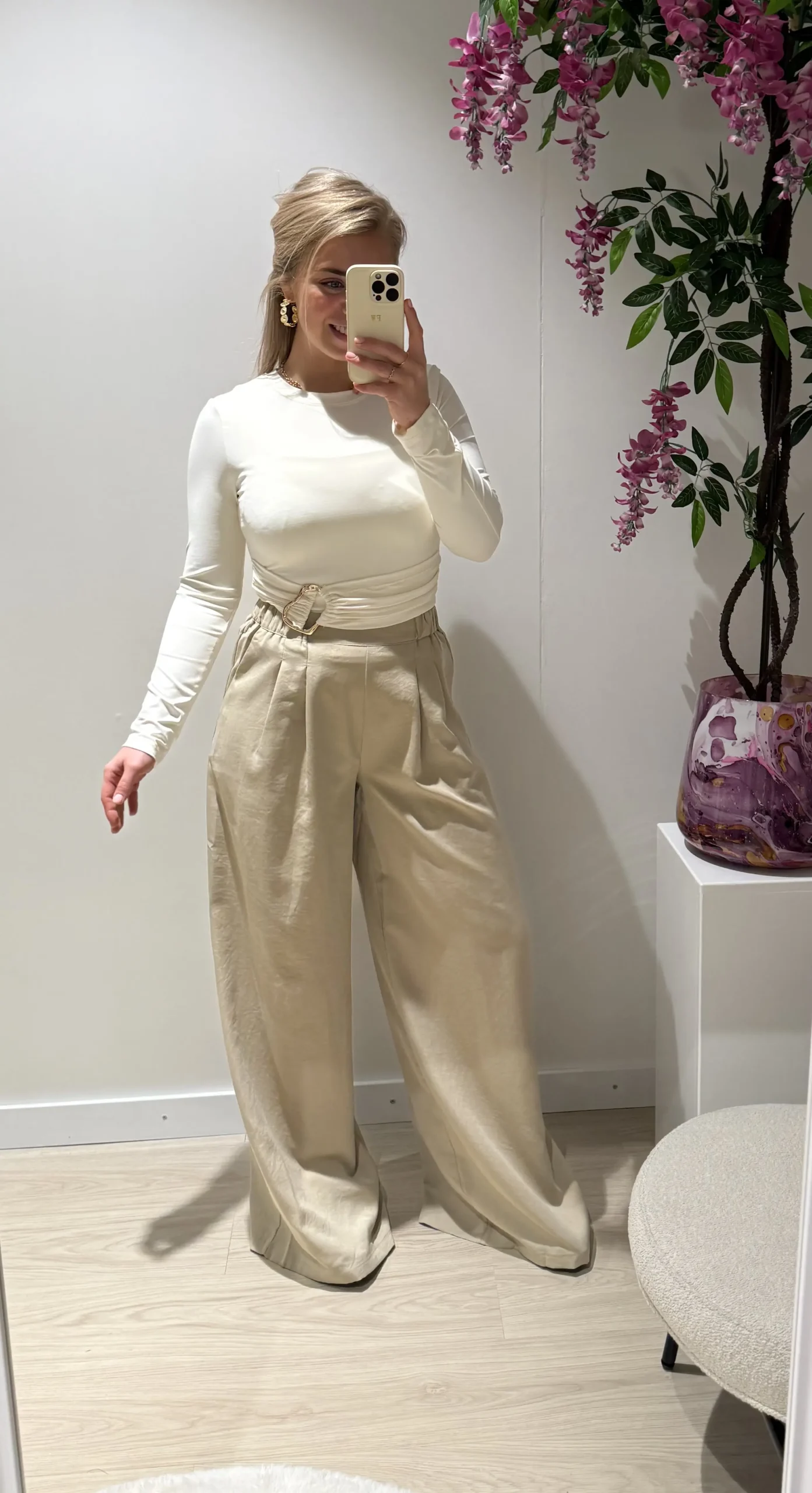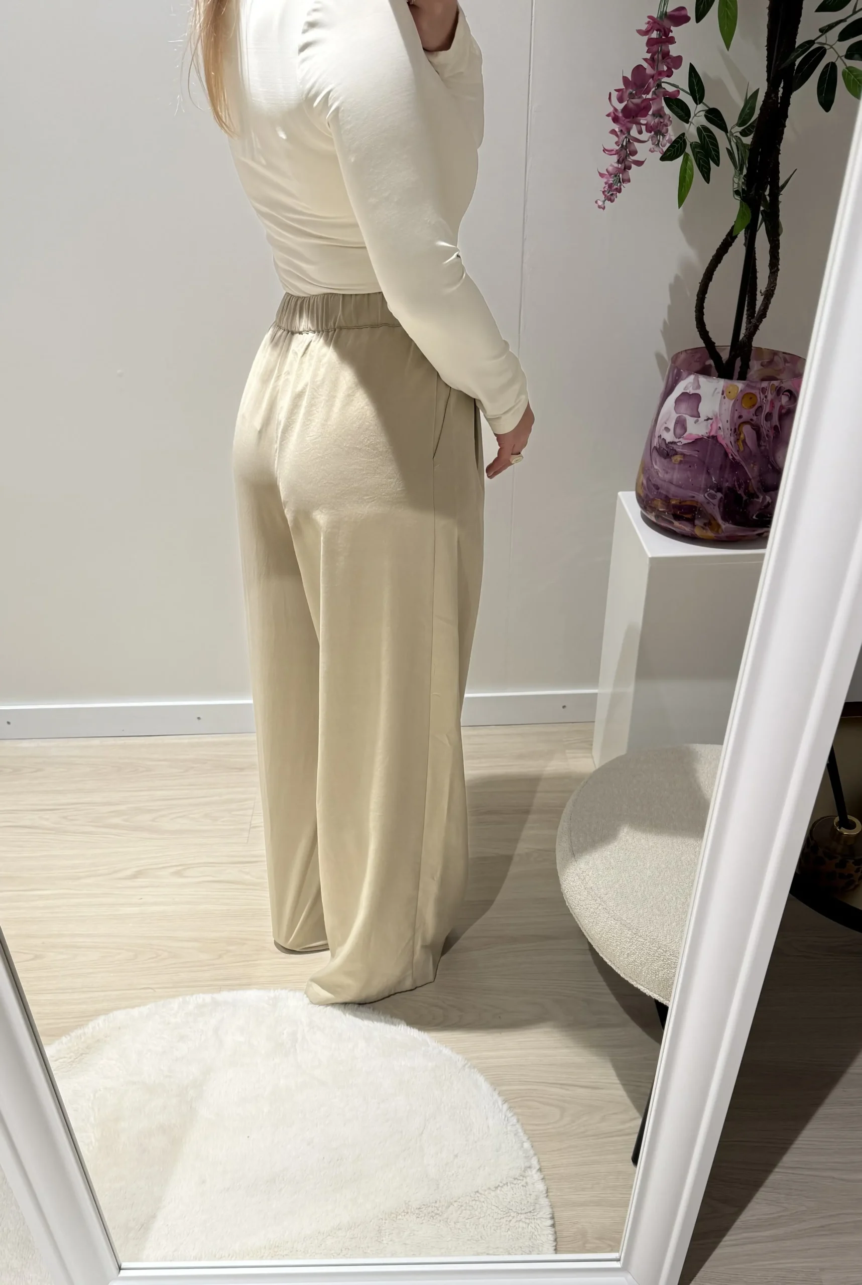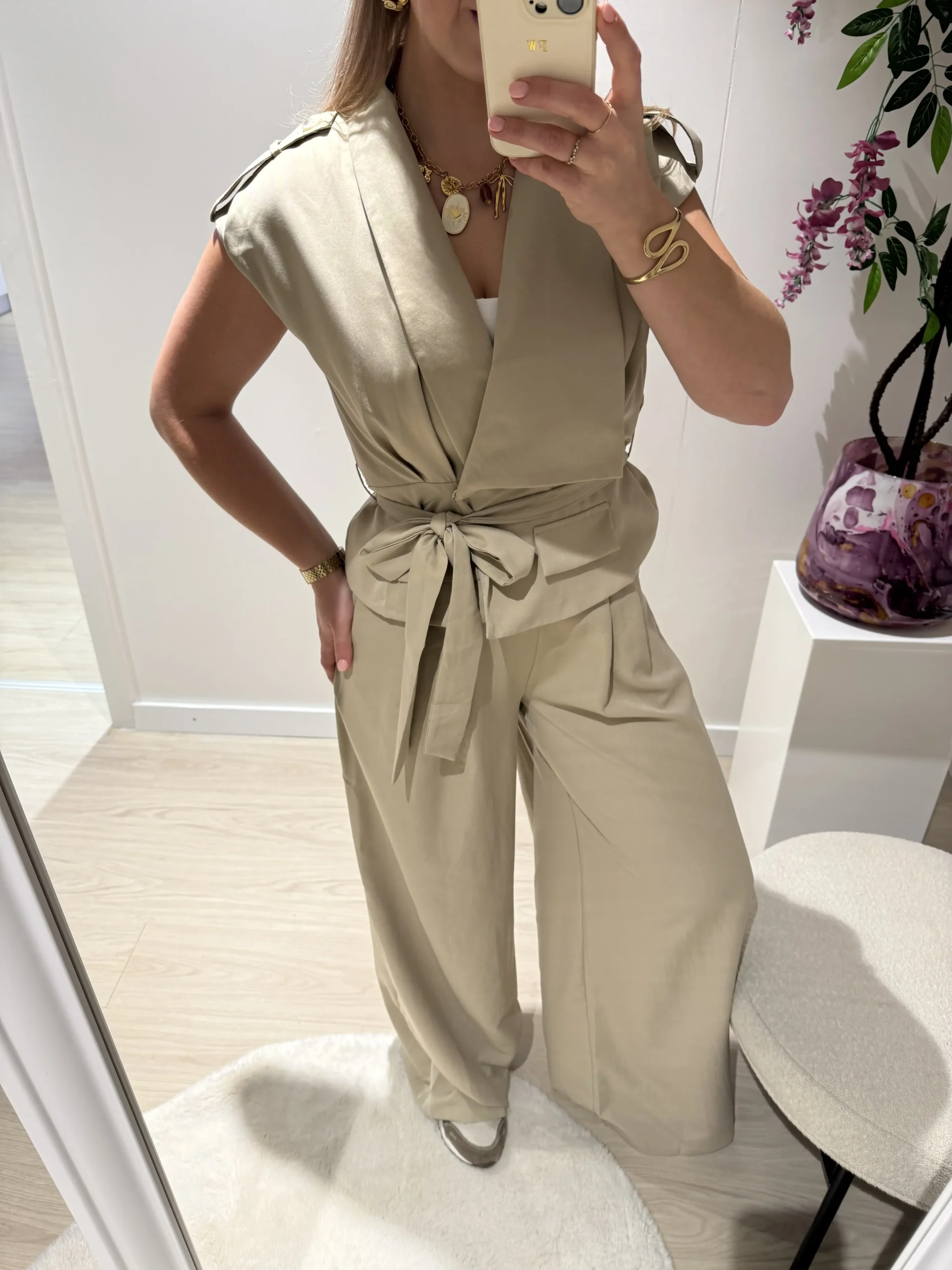 Ocea pantalon taupe is een stijlvolle en comfortabele broek met een elegante wide fit. De elastische tailleband zorgt voor een perfecte pasvorm en extra draagcomfort, terwijl de soepel vallende stof een mooie, vrouwelijke uitstraling geeft. Ideaal om te combineren met de bijpassende Ocea gilet voor een complete set of casual te dragen met een top of blouse.