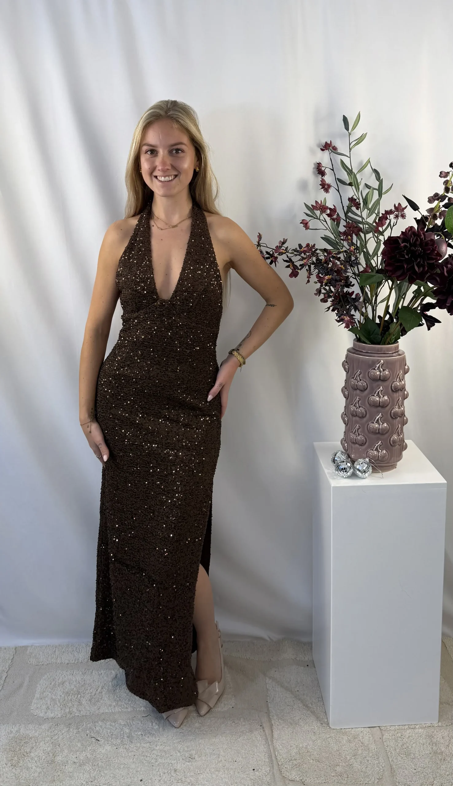 De bruine pailletten jurk straalt pure elegantie en glamour uit. Combineer met hakken en statement sieraden voor een onvergetelijke feestlook — perfect voor diners, events of oudejaarsavond.