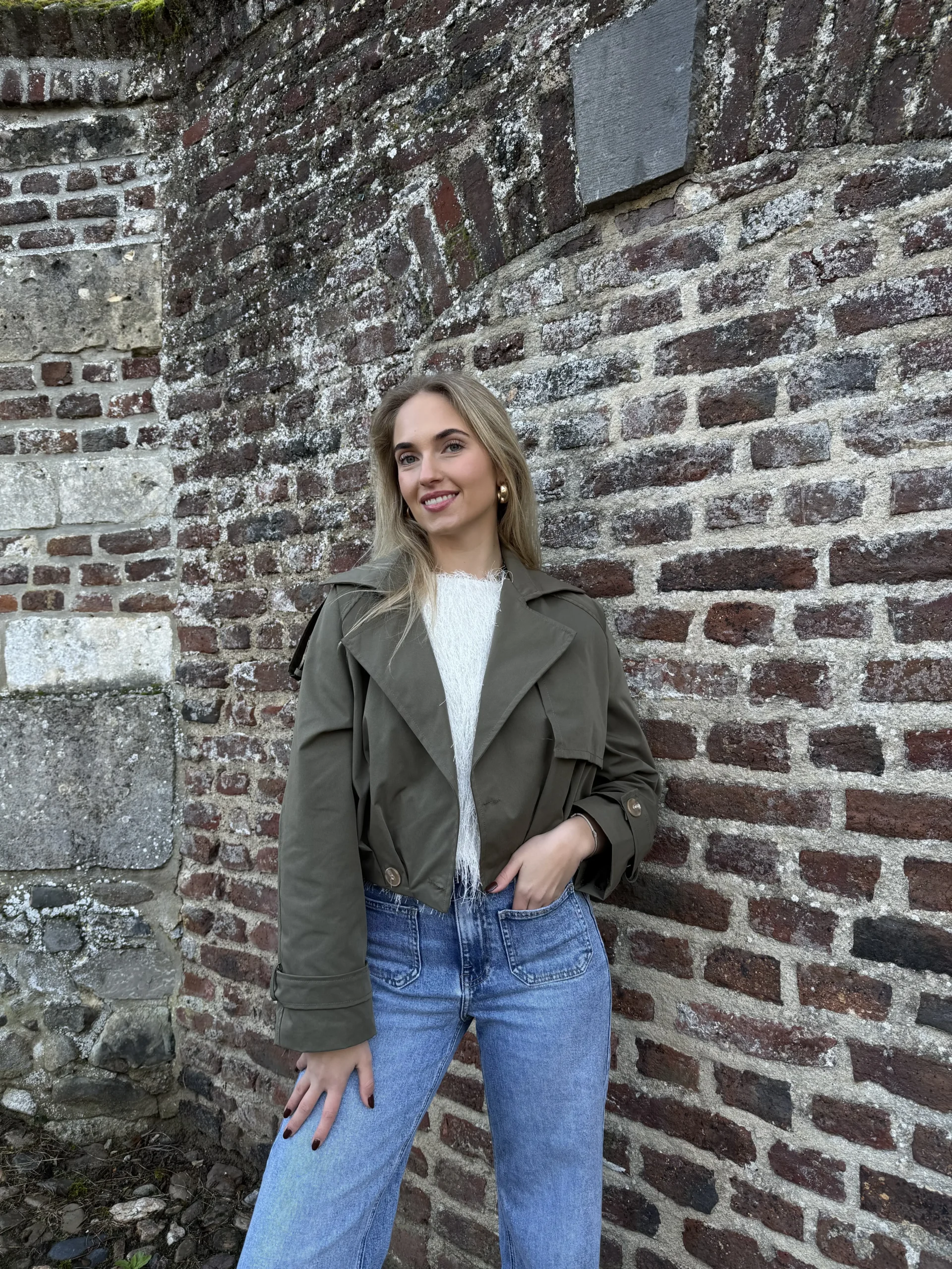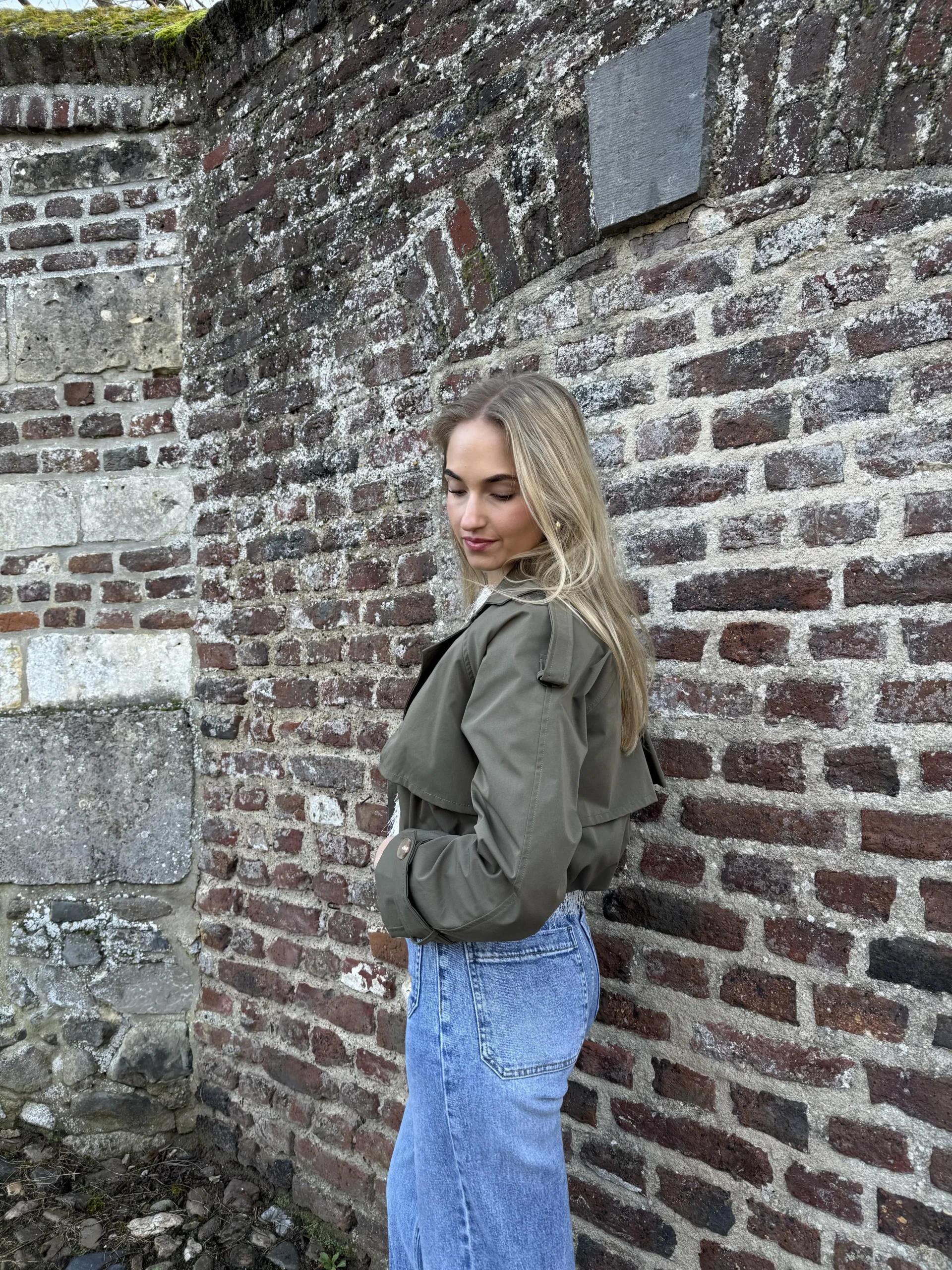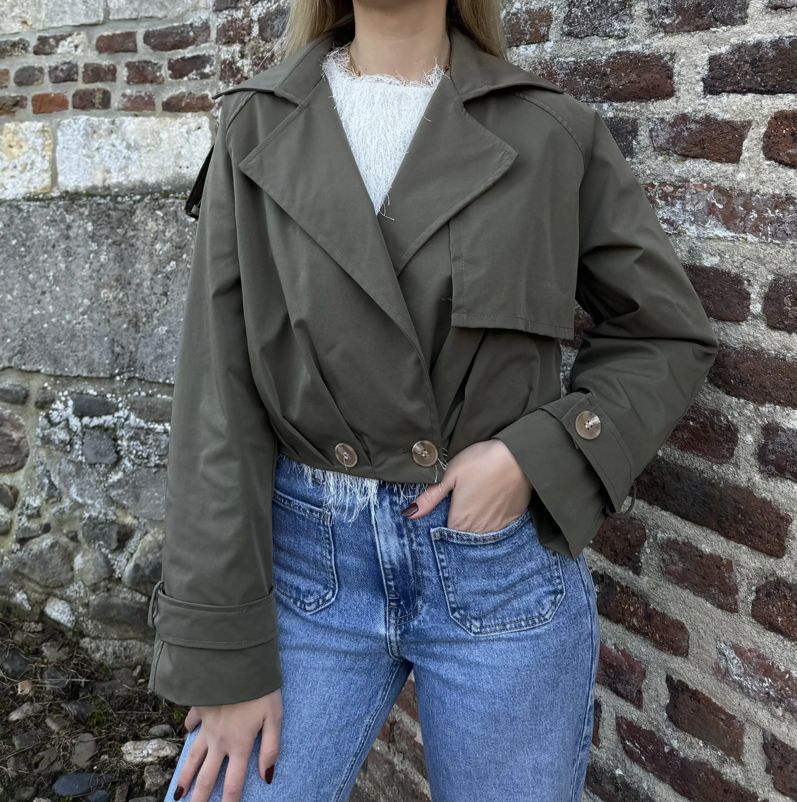 Deze korte trenchcoat is het perfecte tussenjasje voor het voorjaar en najaar. Het model heeft een frisse, moderne uitstraling en is ideaal om snel over elke outfit aan te trekken. Verkrijgbaar in beige en groen, waardoor hij makkelijk te combineren is met zowel lichte als donkere looks. Draag hem casual op een jeans of juist wat chiquer over een jurk of pantalon.