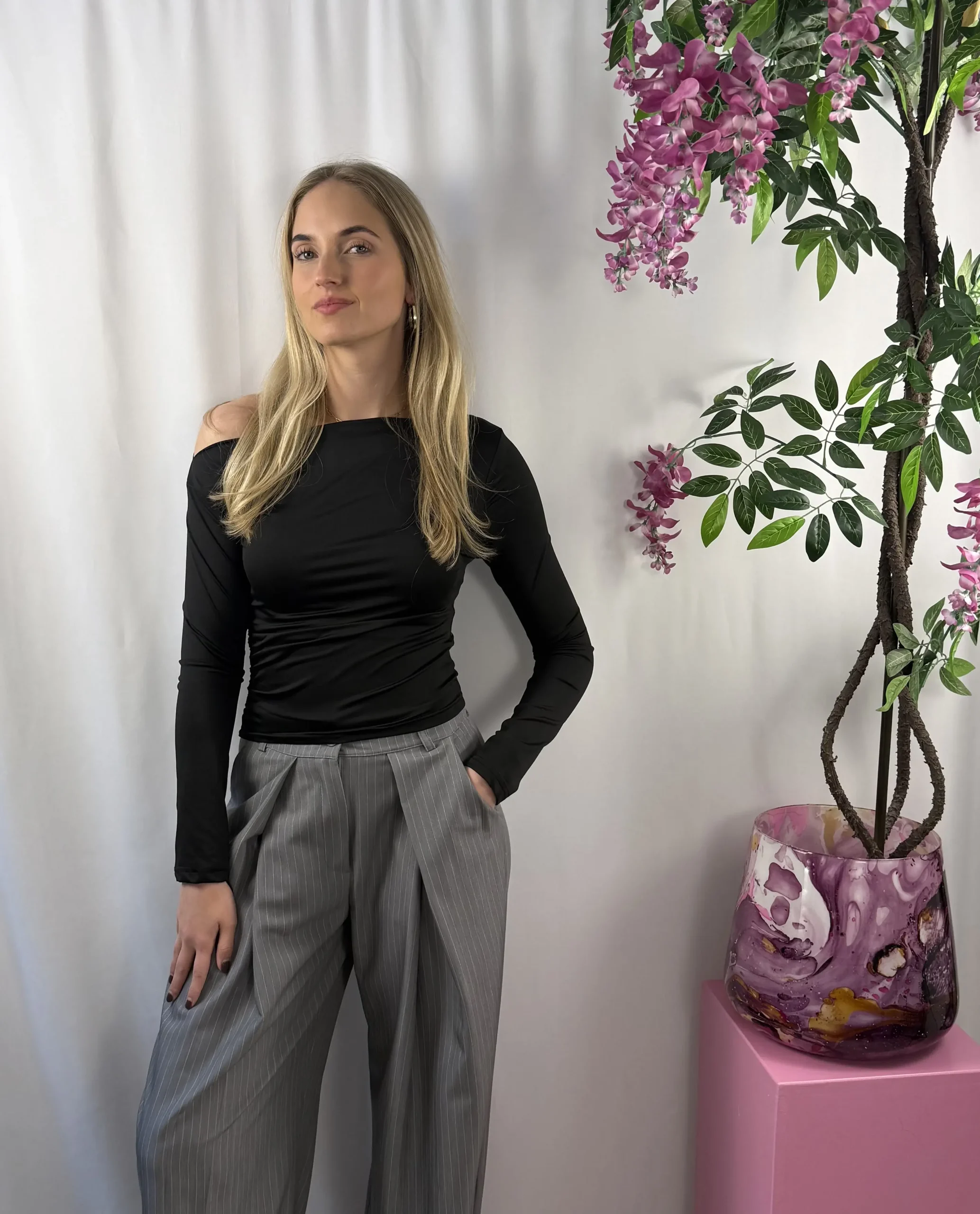 Suus top is een stijlvolle zwarte off shoulder top met een vrouwelijke en elegante uitstraling. Het off shoulder model geeft het item een speelse en trendy touch, terwijl de stretchstof zorgt voor een comfortabele pasvorm die mooi aansluit. Perfect om te combineren met een jeans, rok of pantalon voor een chique maar moderne look.
