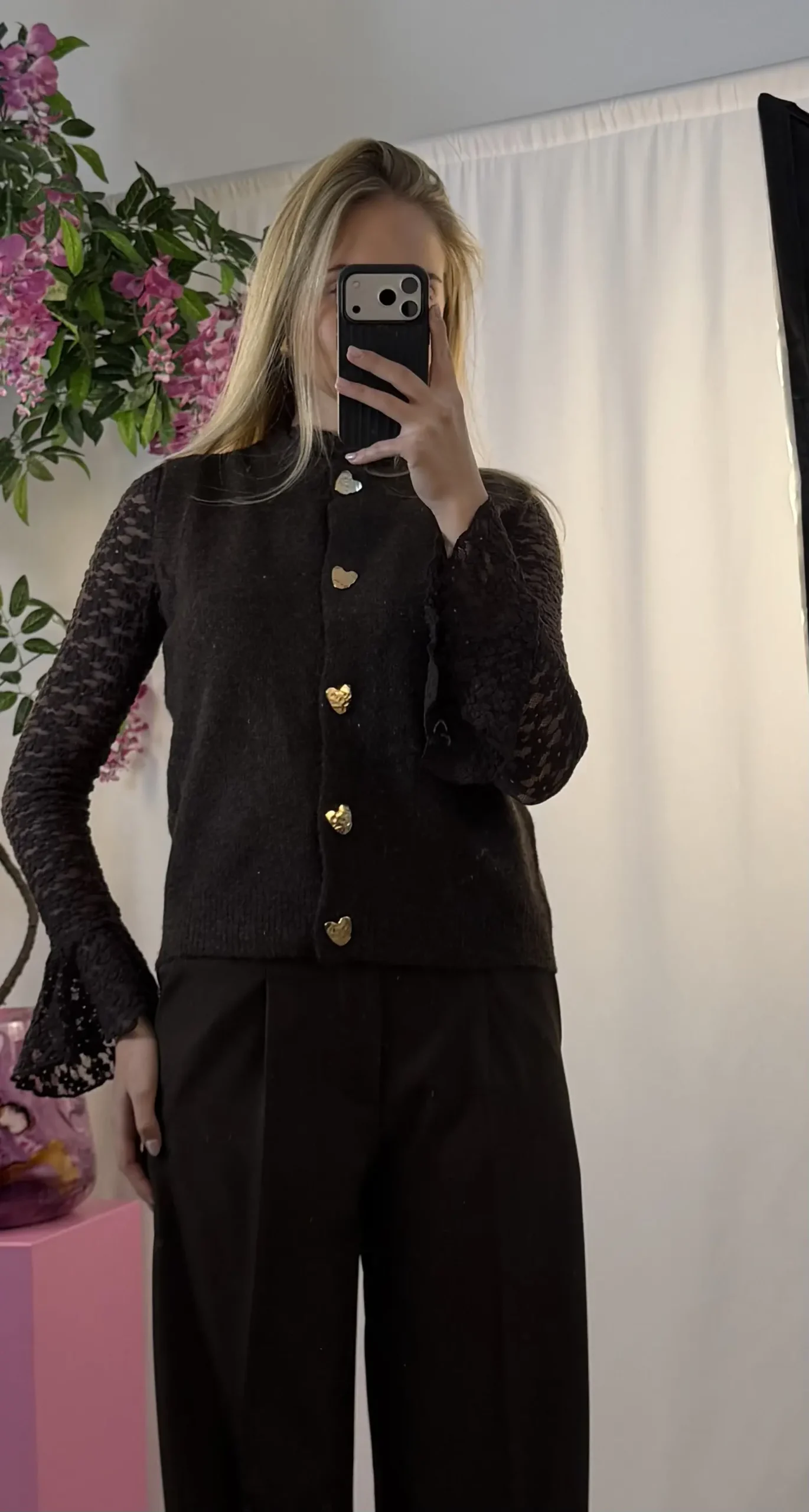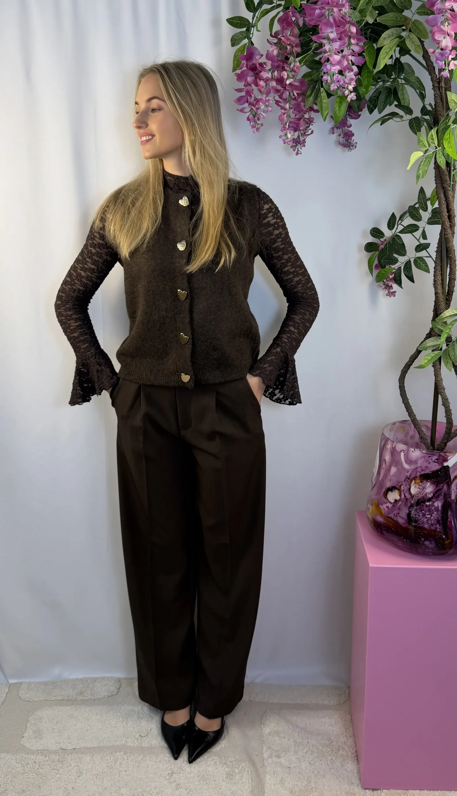 De bruine spencer met hartjesknopen is een musthave voor het najaar en de winter. Perfect om je outfit net dat beetje extra te geven – stijlvol, warm en eindeloos draagbaar.