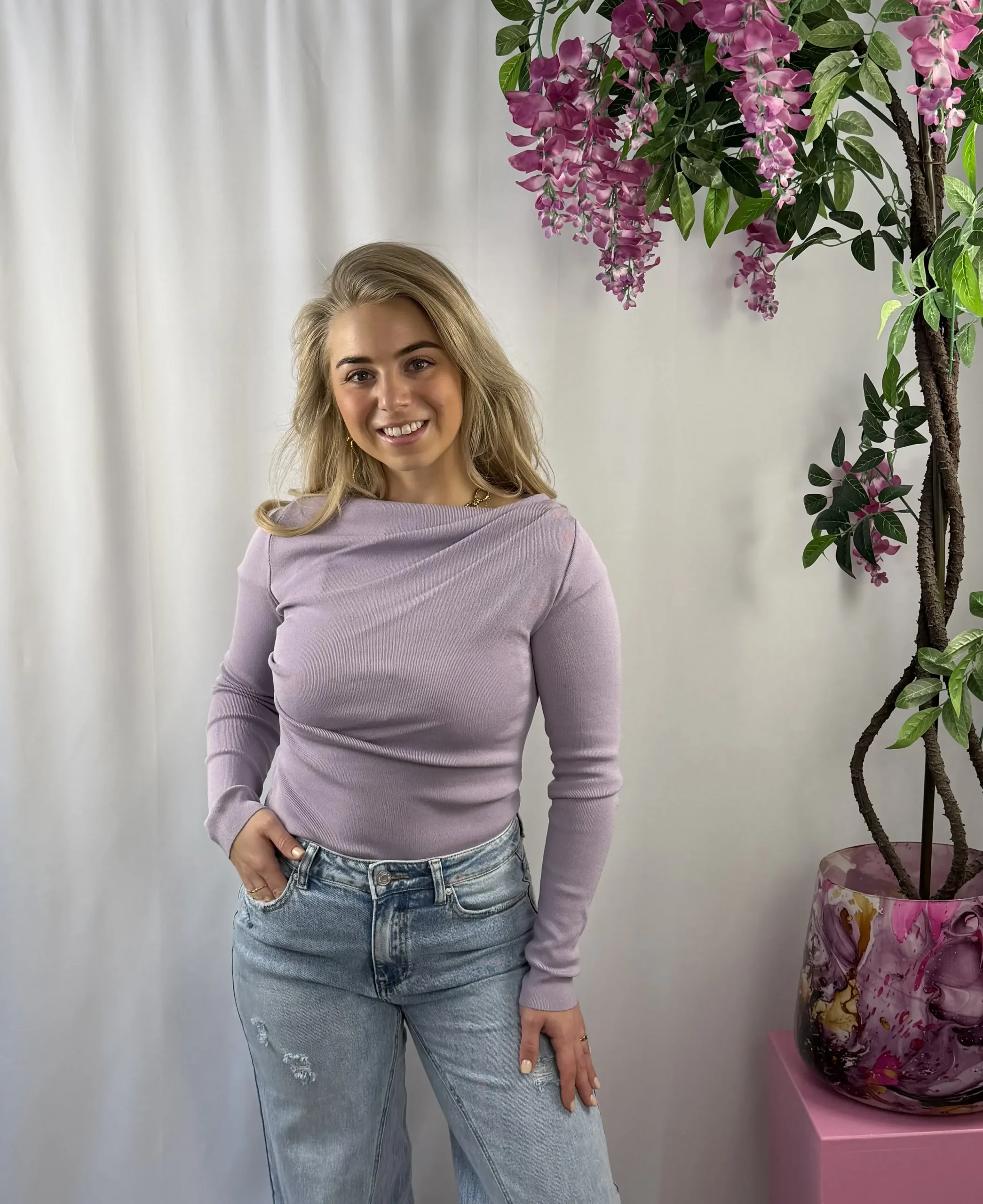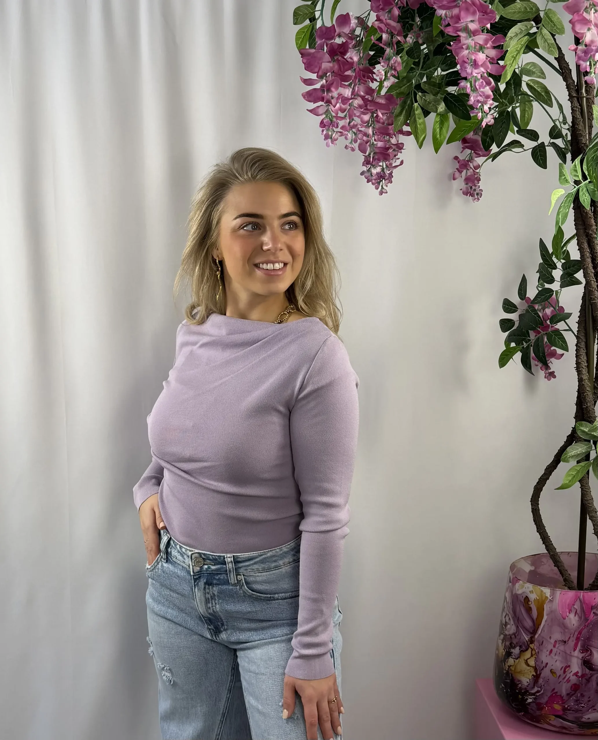 Prachtige aansluitende lila top met een stijlvol detail in de hals. De top bevat veel stretch en sluit mooi aan op het lichaam, waardoor hij comfortabel draagt én een mooie pasvorm geeft. Een perfecte basic met net dat beetje extra. Combineer met een leuke jeans en jouw outfit is meteen compleet.