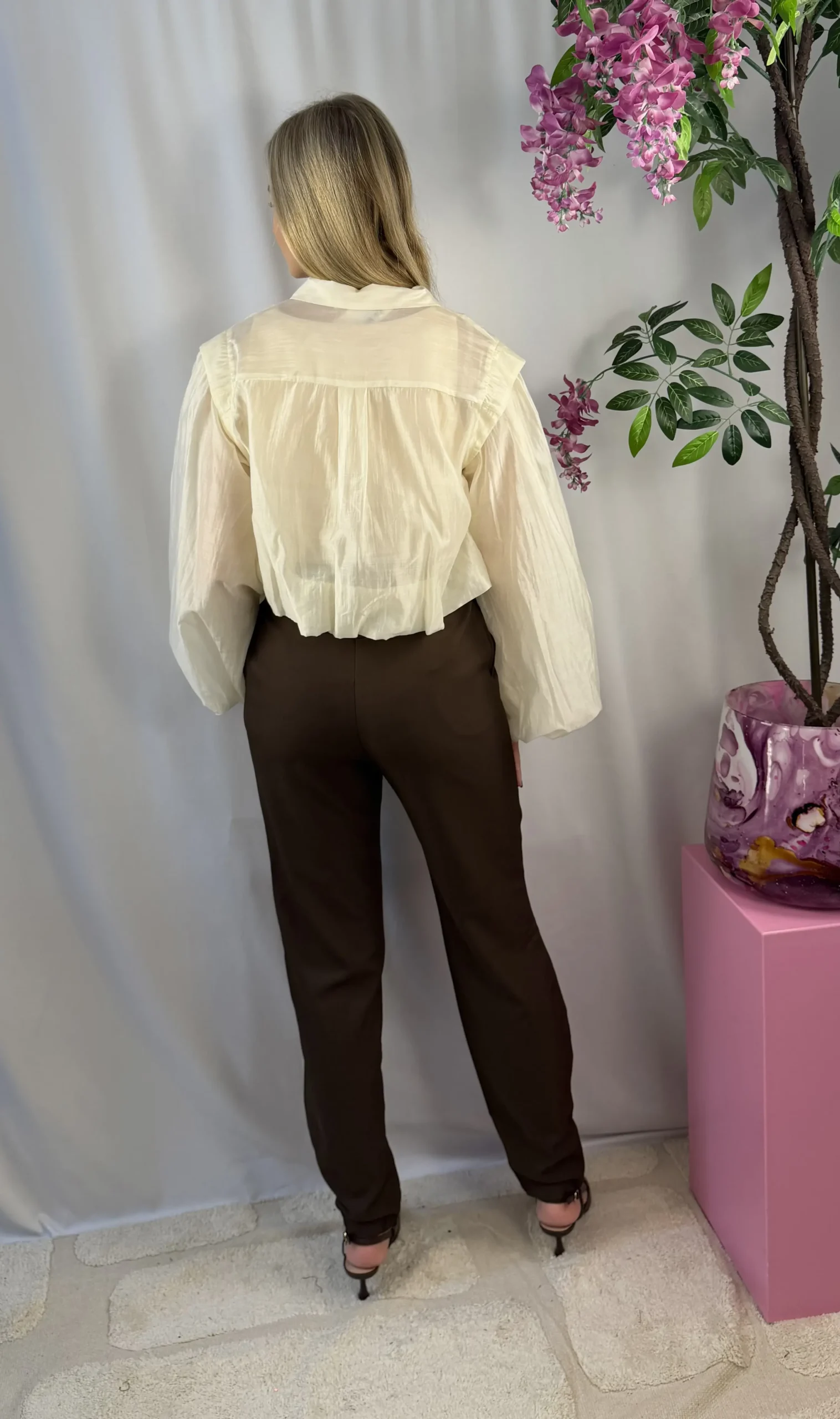 Prachtige cropped crème blouse met een elegante uitstraling. De blouse heeft een luxe look en wordt afgewerkt met schattige parelknoopjes aan de voorkant, wat zorgt voor een stijlvol en vrouwelijk detail. Perfect te dragen op een pantalon, rok of high waist jeans. Een echte musthave voor zowel chique als casual outfits.